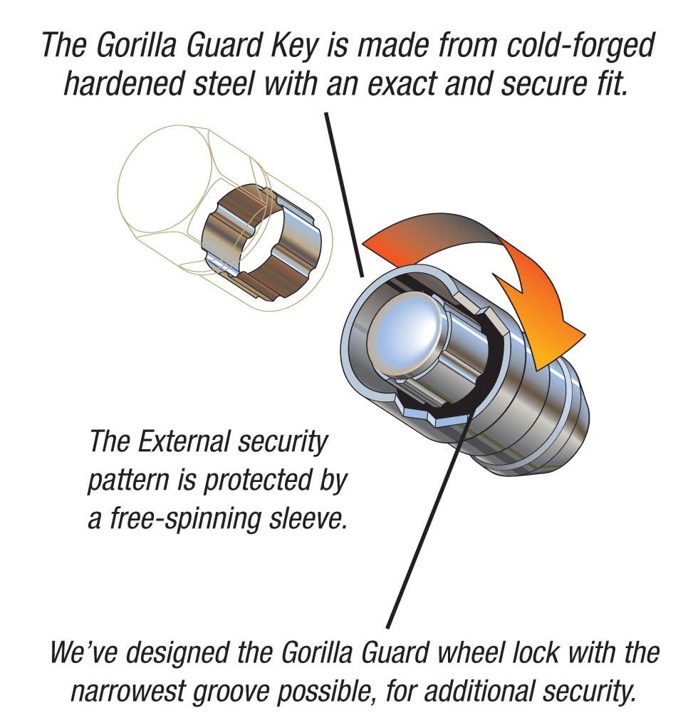 Gorilla Automotive carries a complete line of wheel locks with unfailing quality and finish controlled through every step of manufacturing to deliver lug nuts and locks that outperform. Gorilla features unique locks with an external security pattern that makes it impossible to remove without the matching key. The locks are designed for unsurpassed security made from case hardened steel and chrome plated for lasting beauty.