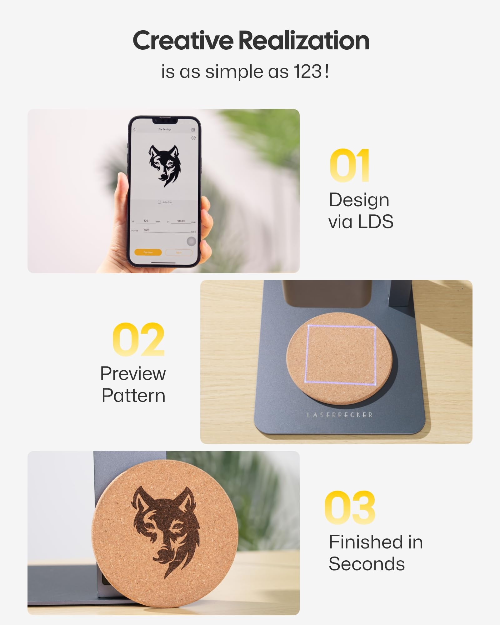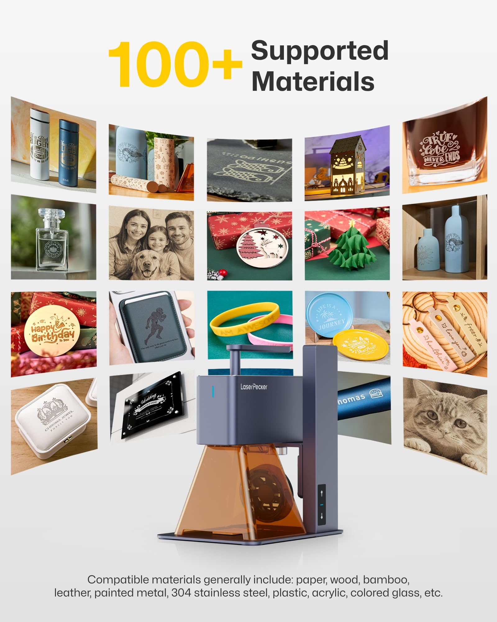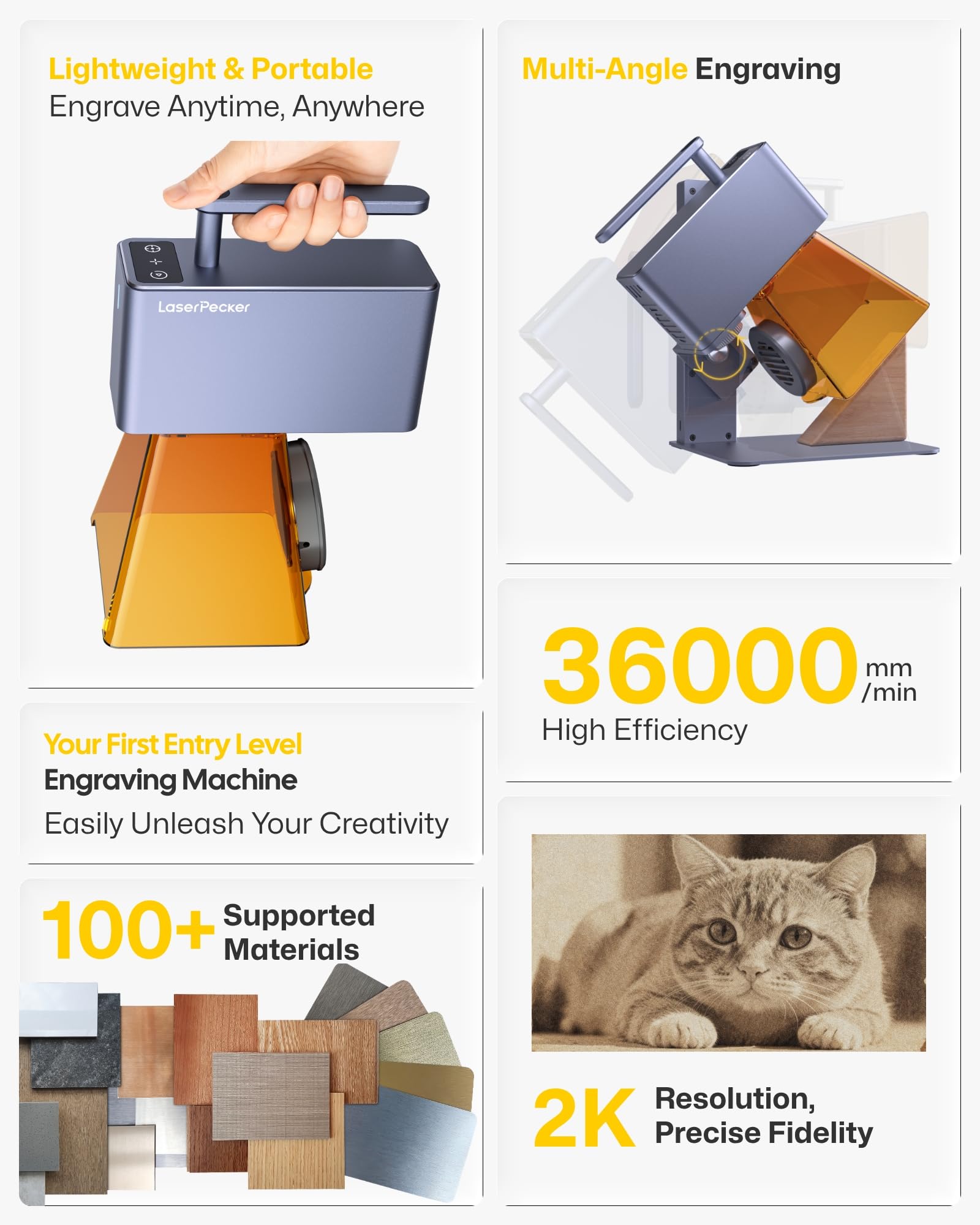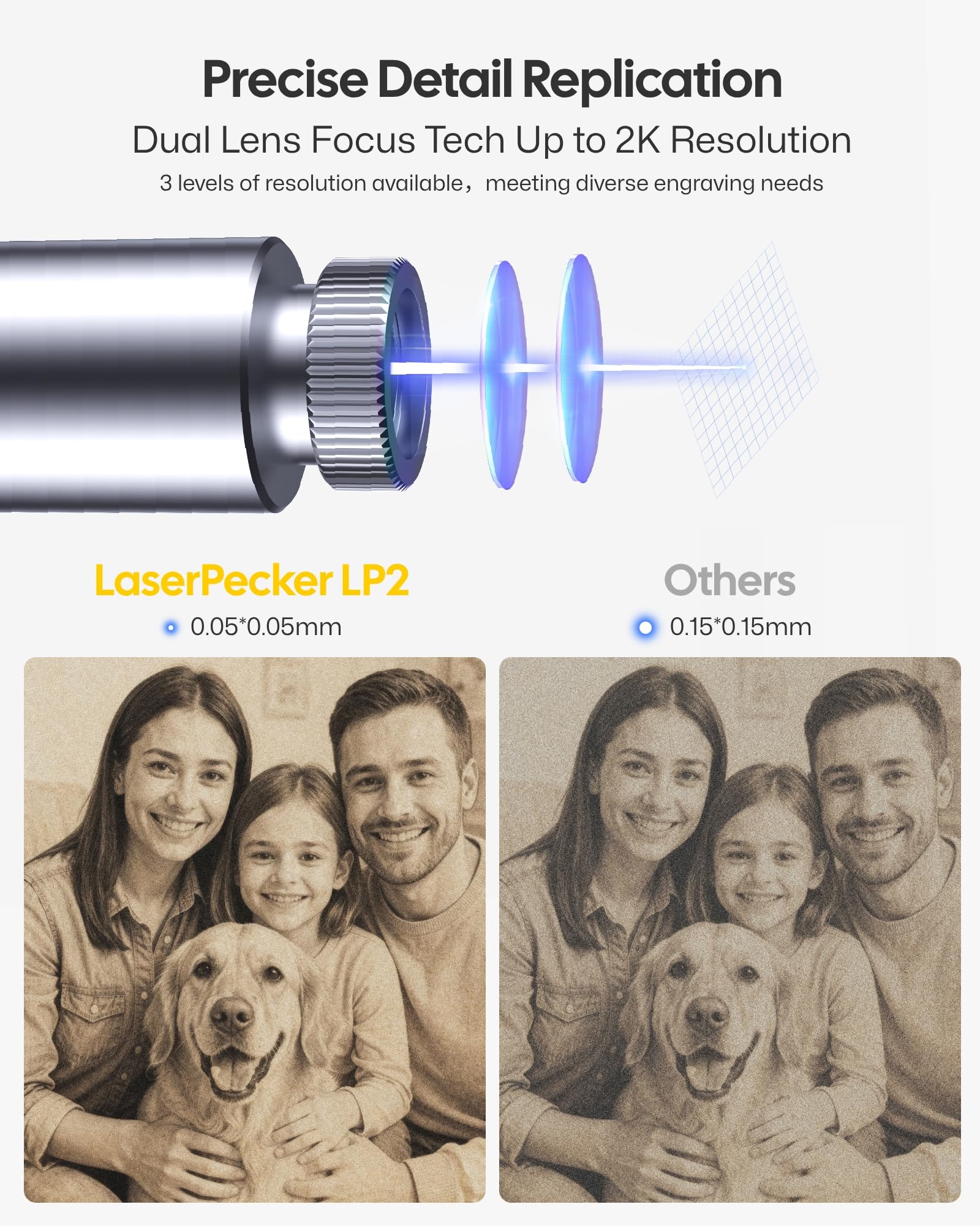 -Best Choice for Laser Engraving: LaserPecker LP2 Laser Engraver with upgrade galvo technology for faster engraving. Max engraving speed of 1417 "/min and frame / graphic preview speed of 8858 "/min. 0.05 mm compressed spot for more details. 3 resolution options (1 K / 1.3K / 2K) for perfect details level
