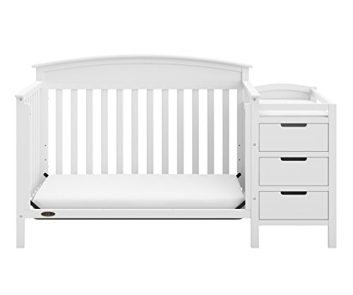 The Graco Benton 4-in-1 Convertible Crib and Changer is a complete sleep, changing, and storage solution for your nursery. Featuring an attached changing table with a water-resistant changing pad and safety strap, as well as 3 space-saving drawers and 3 open shelves for convenient storage of your nursery essentials. Designed for many years of use, the Graco Benton 4-in-1 Convertible Crib and Changer can easily convert from a crib to a toddler bed, daybed and full-size bed with headboard, and features a three-position adjustable mattress support base (optional Graco Toddler Guardrail, Graco Full-Size Conversion Kit, and mattress sold separately). Like all Graco cribs, the Benton is expert tested to meet or exceed all applicable safety standards to ensure the safest sleeping environment for your child. Size: Length (56.7 inches); Width (29.8 inches); Height (42 inches); Weight (41 pounds); Maximum child height for crib stage (35 inches); Maximum recommended weight limit for toddler bed and daybed stage (50 pounds). Graco cribs are exclusively manufactured by Storkcraft. For over 70 years, Storkcraft has been manufacturing quality furniture for infants, toddlers, kids, and teens.