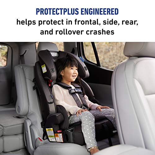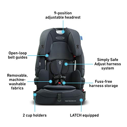 Tranzitions SnugLock 3-in-1 Harness Booster features SnugLock technology for an easy installation in less than one minute using vehicle seat belt or LATCH. This lightweight booster car seat transitions seamlessly from harness booster (22-65 lb) to highback booster (40-100 lb) to backless booster (40-100 lb) and features the no-rethread Simply Safe Adjust Harness System, which adjusts your harness and headrest to 9 height positions to easily adapt for your growing child. Breathable mesh AirFlow channels provide improved ventilation to keep your child cool and comfortable, while space-saving dual cup holders keep your child's drink close by. The seat pad, body support, and harness covers are comfortable and machine-washable, making cleanup a breeze. Fuss-free harness storage makes it easy for your child to get in and out. This harness booster is also LATCH-equipped for hassle-free installation. The seat is Graco ProtectPlus Engineered to help protect in frontal, side, rear, and rollover crashes.