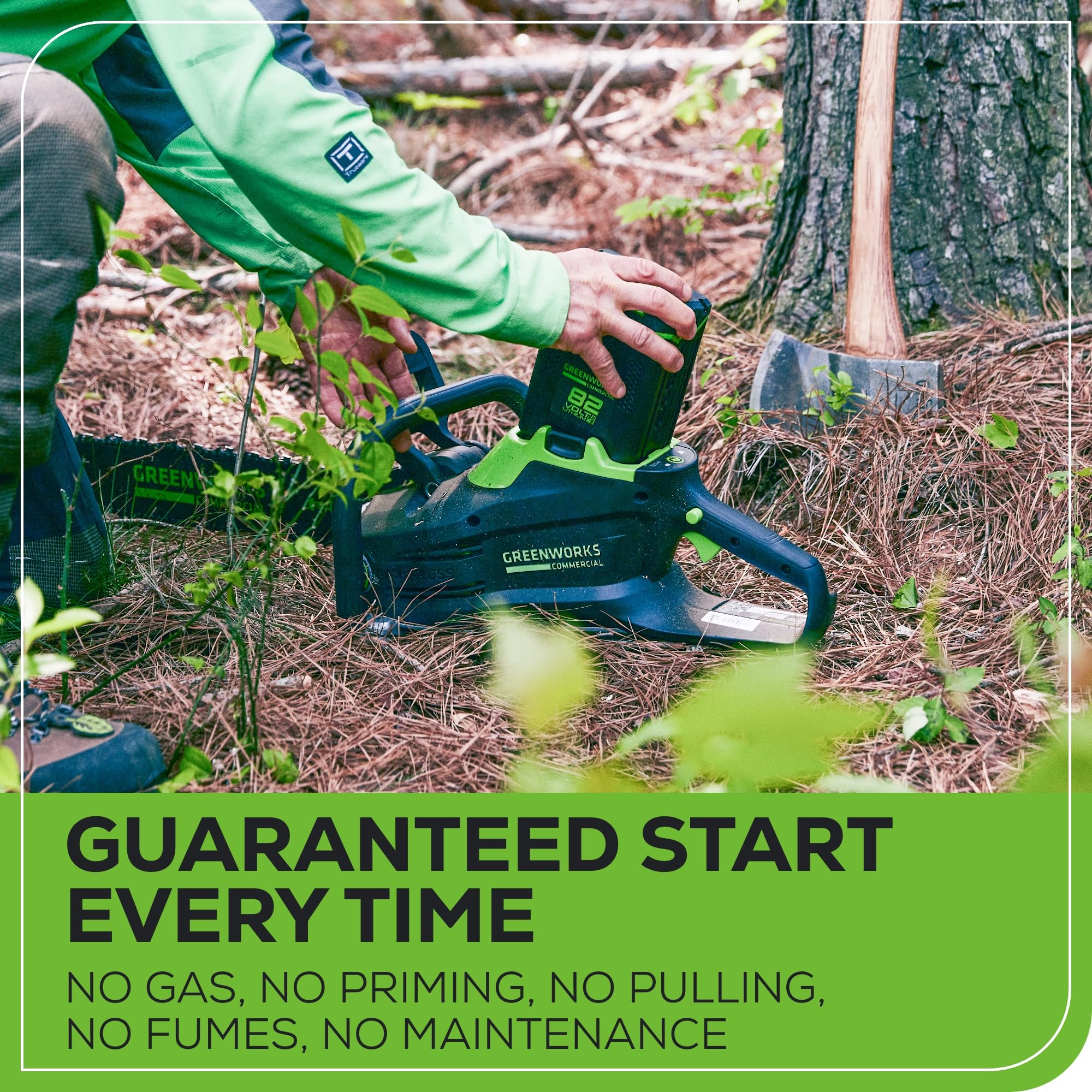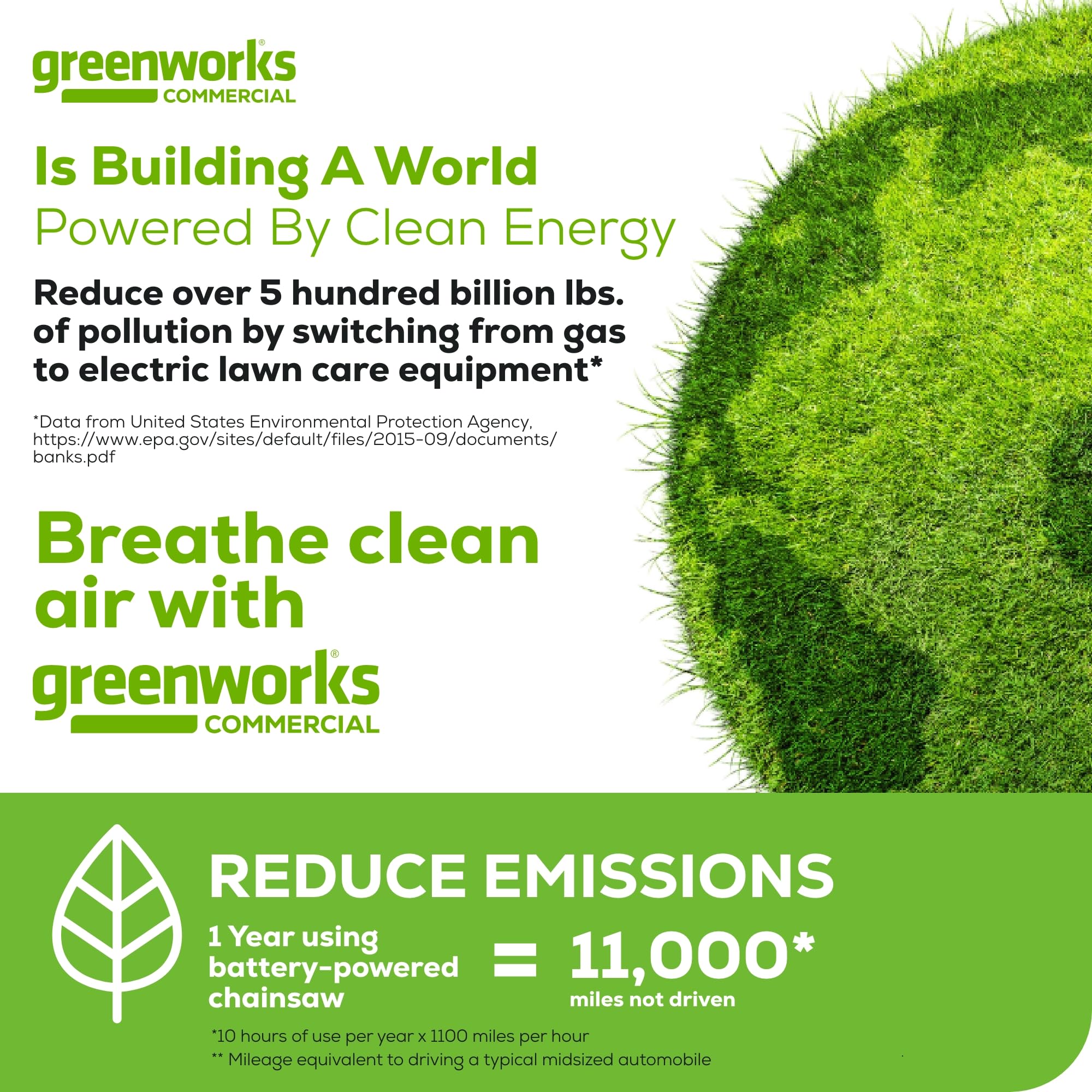 Green Works is starting a revolution in outdoor power equipment starting with its Green Works Pro 82V Li-Ion MAX system. Combined with our Brushless motor, this is the highest voltage, gas equivalent, commercial grade cordless outdoor power tool system in the industry. Featuring the simple electric start, light weight designs and quieter motor, professionals and heavy Dyers can now tackle tough jobs through variable terrain without the hassle of gas, fumes, heavy gear or delicate maintenance needs of gas powered engines. The evolution of Green Works lithium-ion technology and designs have made it possible for professionals to get their jobs done by simply snapping in a battery and pressing a button while delivering high performance power and longer run time to get the job done. Green Works Pro 82V Li-Ion MAX System features a Jet Blower, 18-inch Chainsaw, Hedge Trimmer, String Trimmer, Lawn Mower. With Green Works, we understand that it's not just a toolkit's your life.