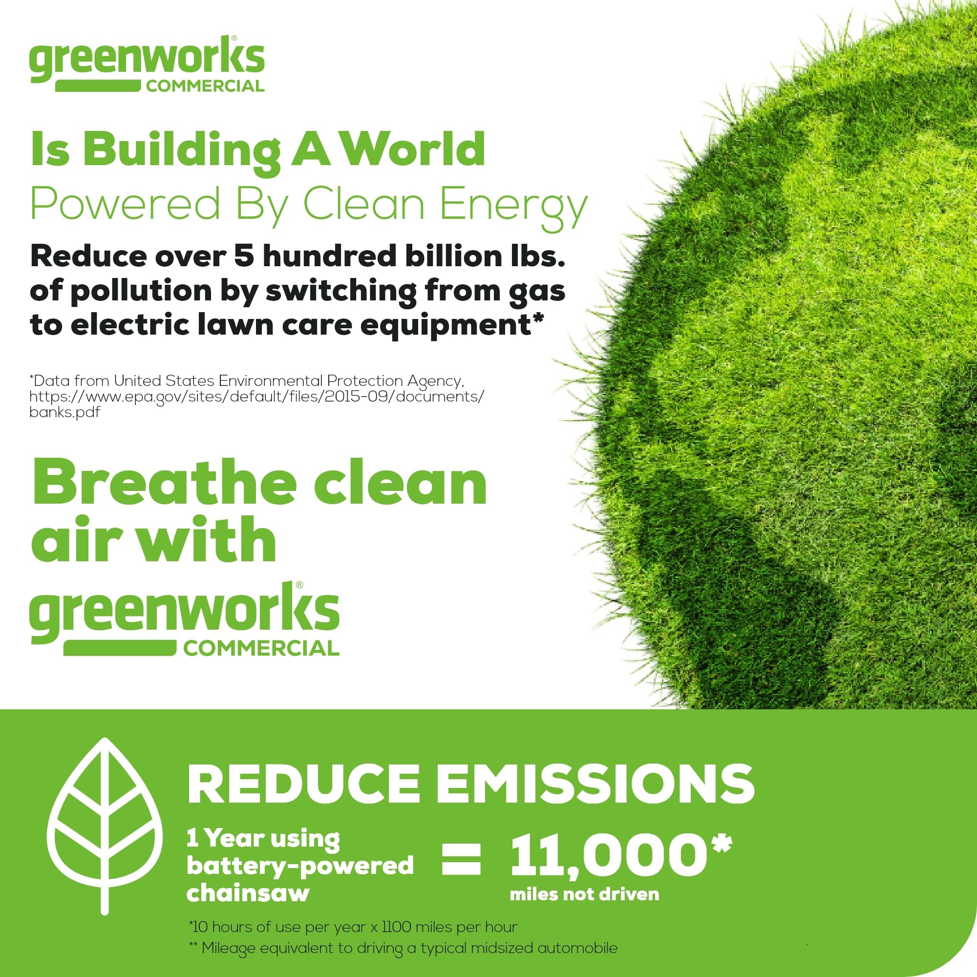 Green Works is starting a revolution in outdoor power equipment starting with its Green Works Pro 82V Li-Ion MAX system. Combined with our Brushless motor, this is the highest voltage, gas equivalent, commercial grade cordless outdoor power tool system in the industry. Featuring the simple electric start, light weight designs and quieter motor, professionals and heavy Dyers can now tackle tough jobs through variable terrain without the hassle of gas, fumes, heavy gear or delicate maintenance needs of gas powered engines. The evolution of Green Works lithium-ion technology and designs have made it possible for professionals to get their jobs done by simply snapping in a battery and pressing a button while delivering high performance power and longer run time to get the job done. Green Works Pro 82V Li-Ion MAX System features a Jet Blower, 18-inch Chainsaw, Hedge Trimmer, String Trimmer, Lawn Mower. With Green Works, we understand that it's not just a toolkit's your life.
