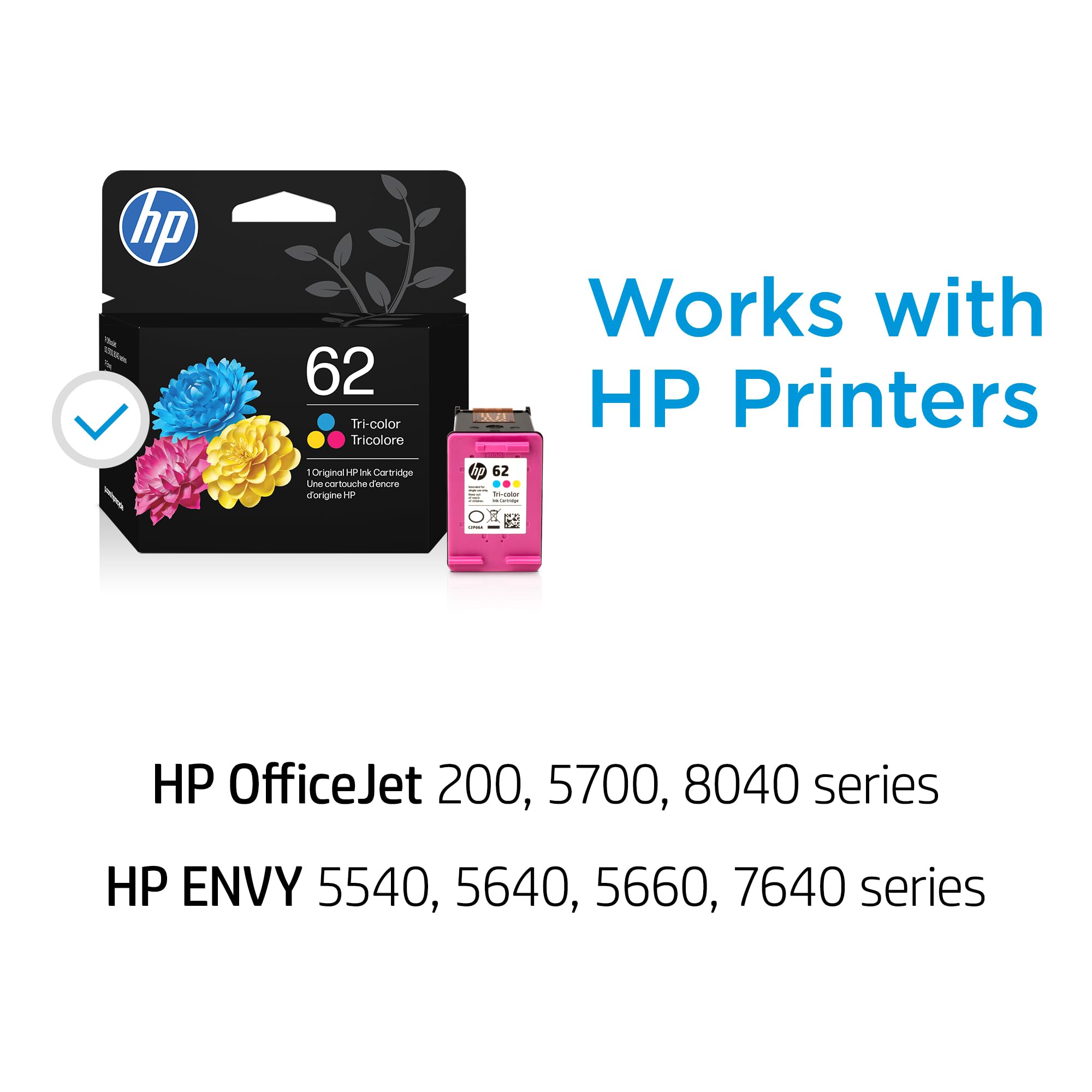 Cartucho de tinta tricolor HP 62 | Funciona con series de impresoras: Envy 5540, 5640, 5660, 7640, OfficeJet 5740, 8040, OfficeJet Mobile 200, 250 | Elegible para tinta instantánea| C2P06AN | El embalaje puede variar