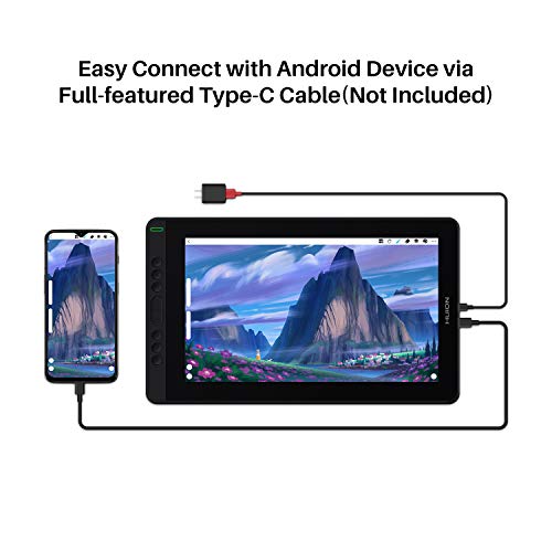 -【Versatile and Higher Accuracy】This tablet is ultra-thin only 11.8 mmnot, not only work as pen display, but also can be used as pen tablet, can be connected with Android device via full-featured Type-C cable(not included). Battery-free stylus support ±60° tilt function on tablet screen. Fastest reaction with 266PPS report rate, 10mm sensing height and 8192 levels of pen pressure sensitivity allow your work to be more vibrant with diverse lines and layers.