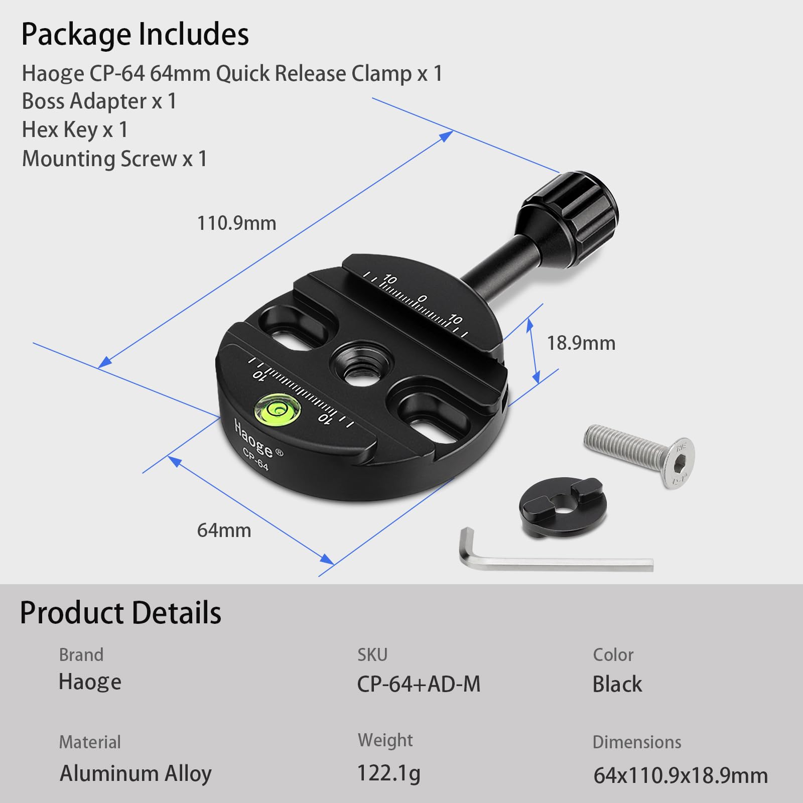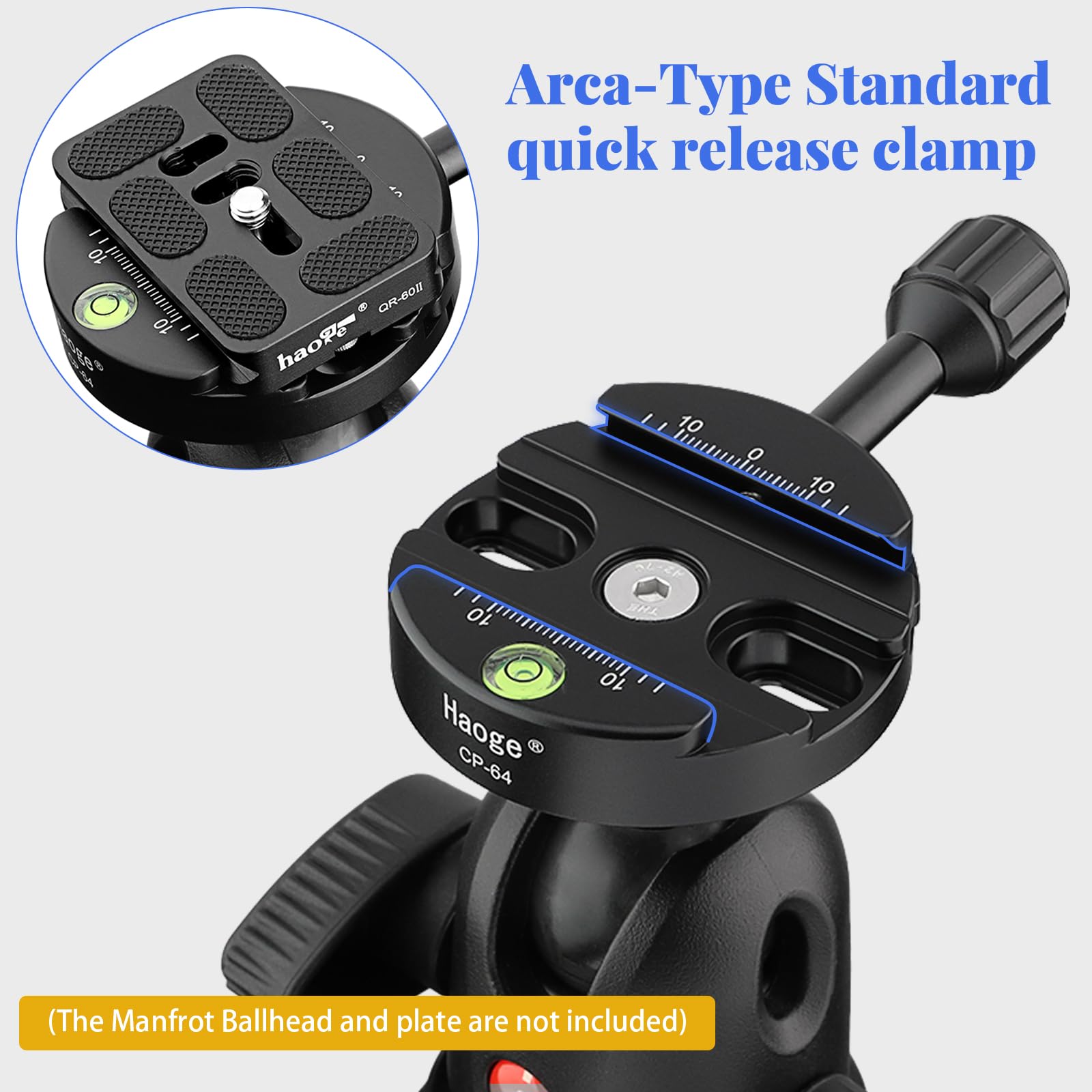 Haoge Combo Boss Adaptador con CP-64 Abrazadera de liberación rápida Compatible con Arca-Swiss de 64 mm para reemplazo de Abrazadera de Cabeza de Bola de trípode Manfrotto
