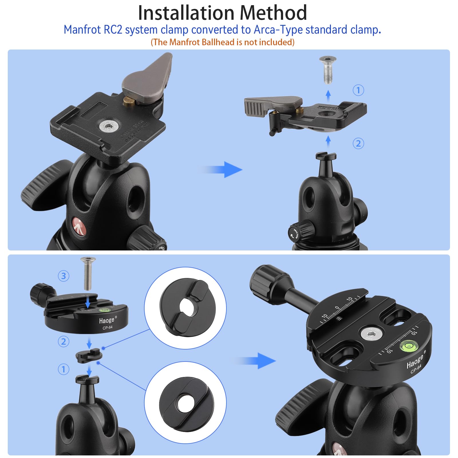 -Own a Manfrotto 484, 486, 488, 494, 496, 498, 054, 055 and 057 series ball head and wish to use AS (Arca-Swiss) compatible system? The Haoge Female to Male Boss Adapter and 64mm Clamp allows you to more easily replace the clamp on your Manfrotto ball head.