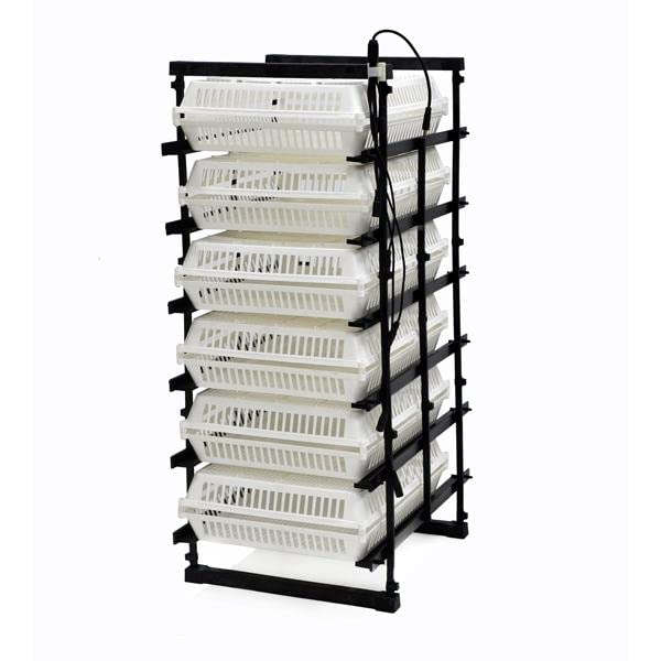 Need the egg turners and baskets for your amazing DIY incubator? Look no further! This setup boasts high hatch rates and can set (then hatch) up to 180 chicken eggs. This unit can be used with interchangeable egg turning racks and baskets. Simply build your cabinet around the ConturnTM180 station. Your only job is to focus on the heat and humidity! Each egg turner level holds a total of six modular standard egg racks which allow for any sized egg. Concerned about hatch rates? Our turners are vibration-free to reduce any stress on the egg. Why do you need automatic egg turners? During incubation, eggs must be turned several times a day to prevent the yolk from settling on one side or the other. Let this automatic turner do the hard work for you! Fits chicken, turkey, duck, goose, peacock, partridge, pheasant, and quail eggs!
