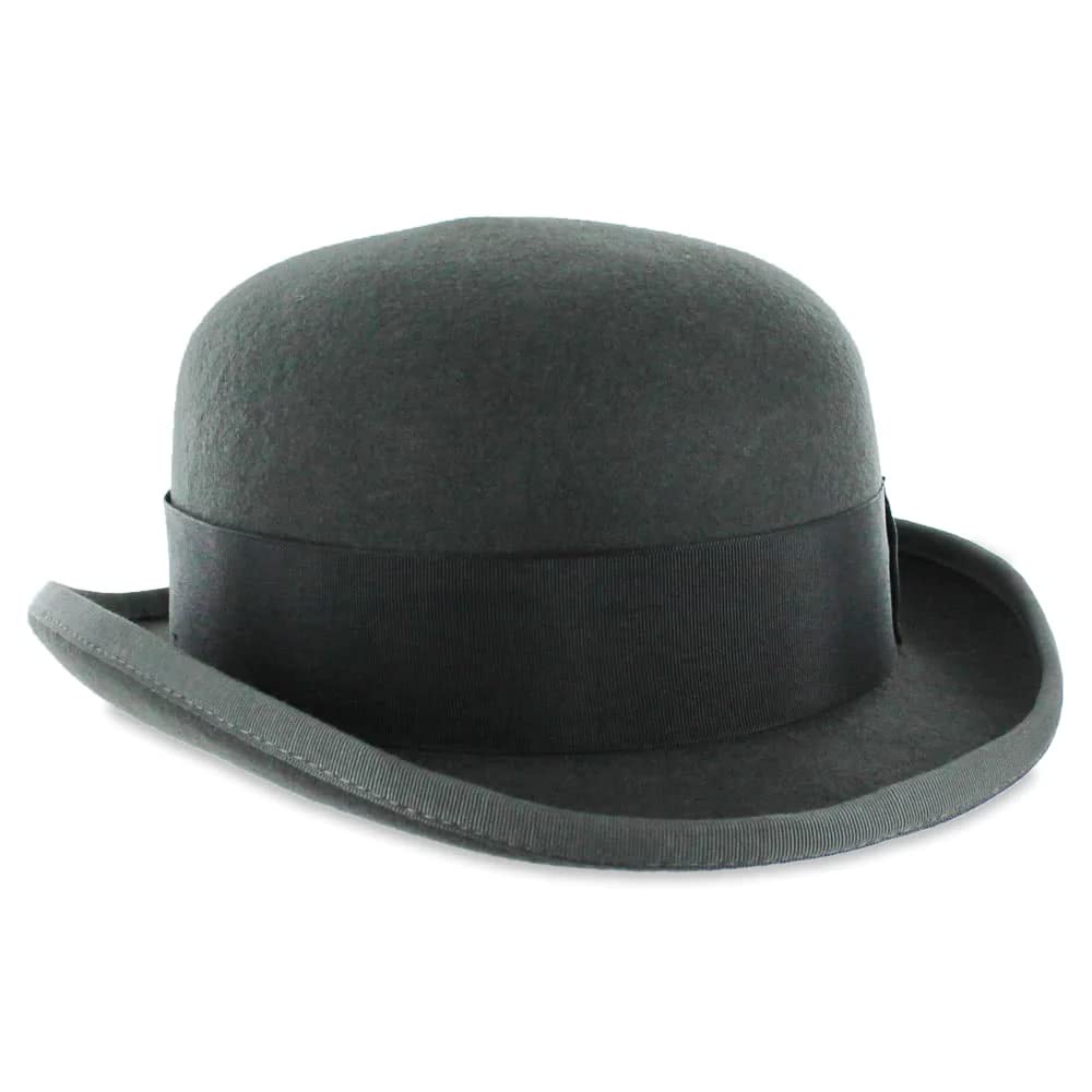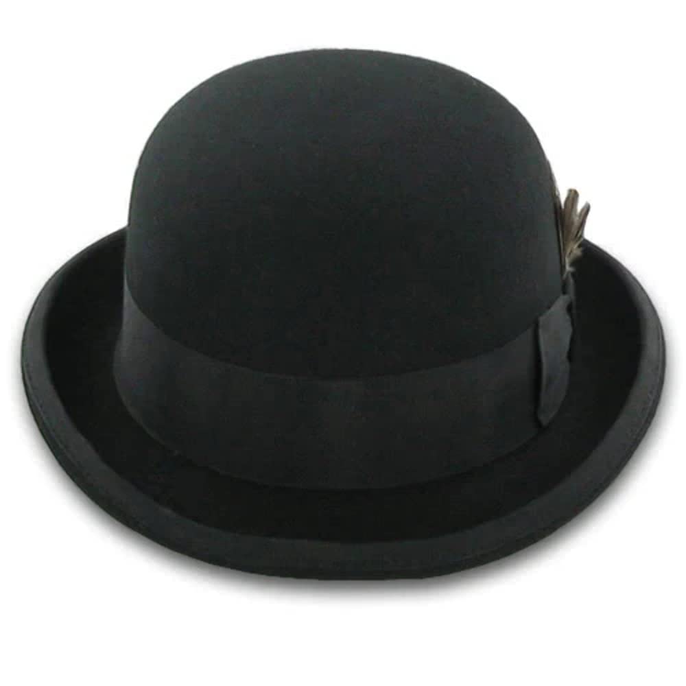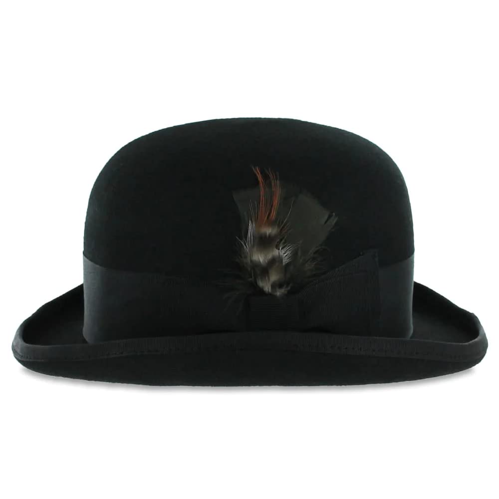 Description "Elevate your look with the Belfry Bowler, a distinguished derby/bowler hat that channels the timeless elegance of the mid-19th century. Once popular among coachmen and gamekeepers, this 100% wool felt hat boasts a classic rolled brim with a ribbon bound edge and a perfectly rounded crown. A sophisticated grosgrain ribbon band and a removable feather accent provide the finishing touches, while a luxurious leather inner band ensures comfort."