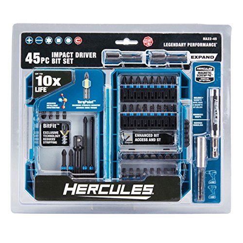 Description Extremely tough alloys and advanced design make these Hercules impact bits outlast the others. Packed in a jobsite-tough case with easy-access bit storage, these drivers are capable of driving over 1500 screws before showing signs of wear - up to 10x life! This insert bit set comes with the Hercules magnetic drive guide and bit holder with ScrewLok technology for fast bit changes without dropping or wobbling. Exclusive BitFit design gives you the best fit in fasteners to reduce stripping. Advanced TorqPoint design for max shock absorbing, making these the preferred bits for use with Hercules drill/drivers and impact drivers. Rugged impact resistant S3 steel for longer life and use in higher torque applications Premium grade Phillips, slotted, square and star driver bits 1/4 in. shank Quick change chuck adapter and magnetic bit holder Convenient storage case Specifications Name 45 Pc Hercules Impact Driver Bit Set SKU 63383 Model HA22-45 Brand Hercules Material S3 steel Quantity 45 Product Weight 1.4 lbs. Shipping Weight 1.30 lb. Size(s) (2) magnetic bit holders; (1) 3/8 in. socket adapter; (2) magnetic nut drivers 1/4 in., 5/16 in.; Slotted: 1 in. L, #6, #8, #10; Phillips: 1 in. L, (1) P1, (8) P2, (2) PR2, (1) P3, 2 in. L (2) P2, (1) P3, 3-1/2 in. L (1) P2Square: 1 in. L, (1) SQ1, (4) SQ2, (1) SQ3, 2 in. L (1) SQ2, 3-1/2 in. L (1) SQ2Hex: 1 in. L, (1) 3/16 in., (1) 1/4 in.Torx: 1 in. L, (1) T15, (4) T20, (3) T25, (1) T30, 2 in. L, (1) T20, (1) T25