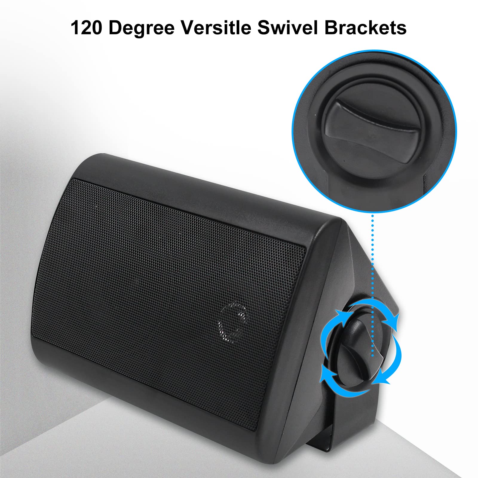 -VERSATILE SWIVEL BRACKETS: Making sure you were able to easily place these wall mount speakers in your most desired location we added easy install swivel brackets that allow up to a 120 degree range of motion while the front facial can rotate up to 90 degrees