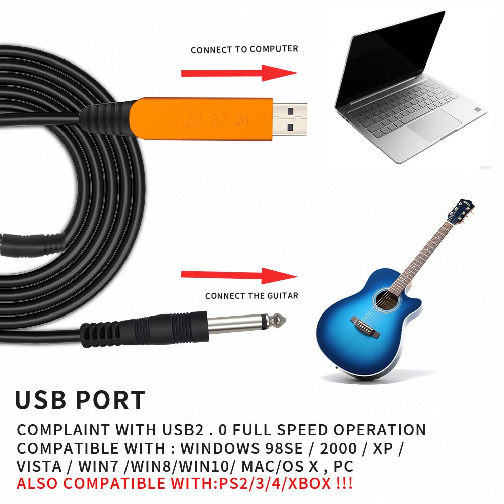 -[ Widly Used ] The guitar cable is widly compatible with mainstream operating systems (Windows/macOS) and PS2/3/4/XBOX.Compatible with most eletronic instruments such as guitar.