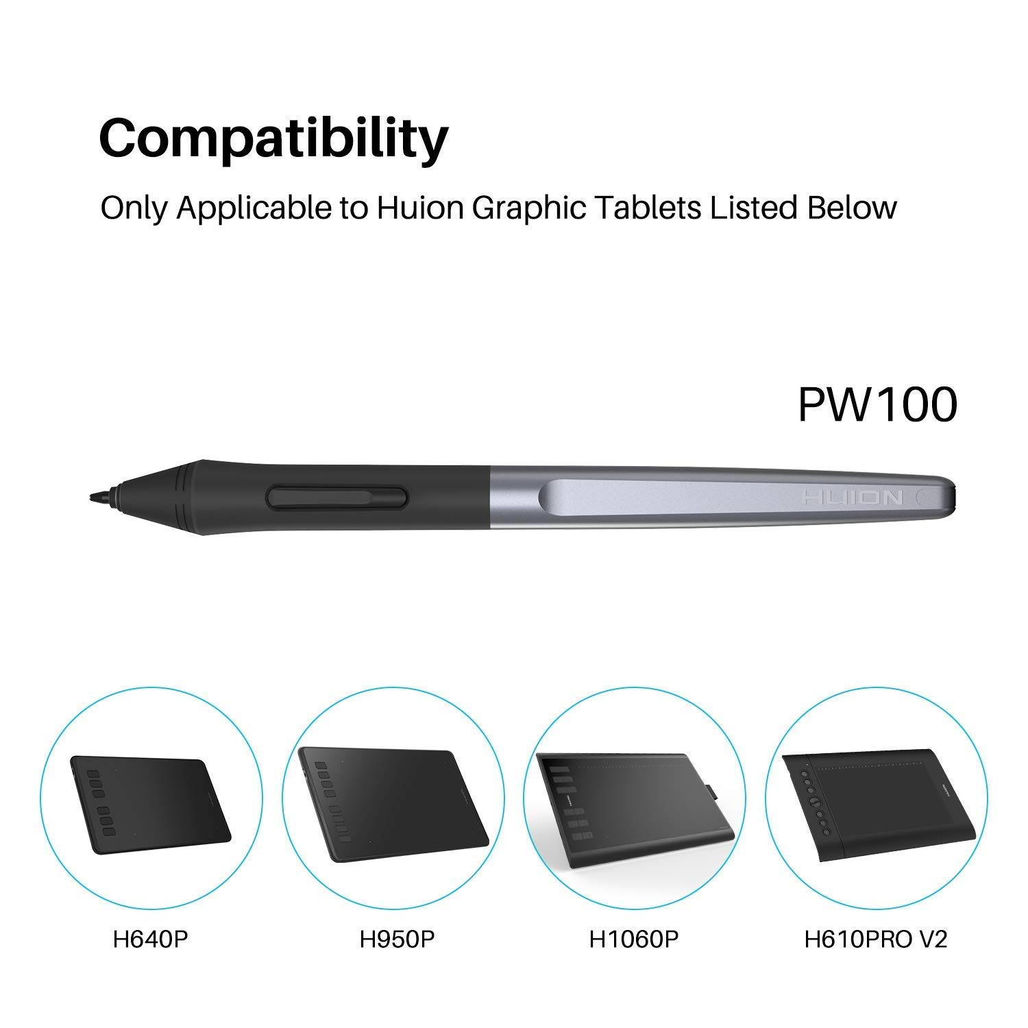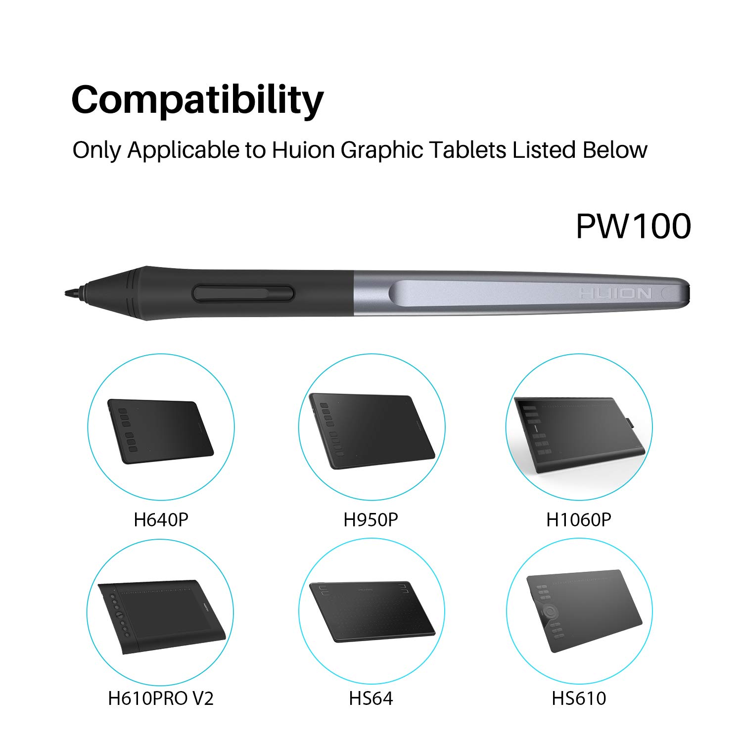 -Battery-free Stylus - Only COMPATIBLE to Huion Inspiroy H640P/H950P/H1060P/H610Pro V2/HS610/HS64/H420X/H580X/H610X; Never worry about pen-charging, and eco-friendly of use; Without operating battery, the pen is only 16g in weight, and its front end is made of wearable silicone for soothing feel.