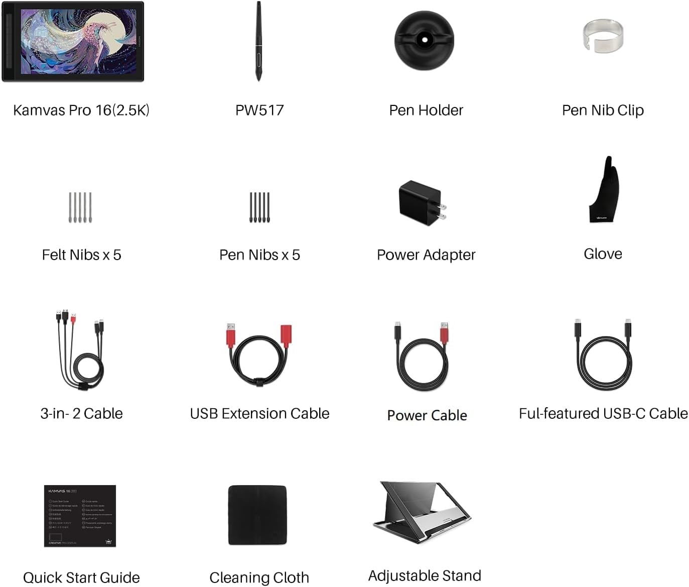 -Considerate Accessories: An adjustable stand is included so that you can quickly find your preferred position for all-day comfort. Except for standard nibs, it also comes with 5 felt nibs to meet different creative needs. Drawing glove, pen holder, extension cable... Everything you need is included. Kamvas Pro 16 (2.5K) is a creative tool you can reply on.