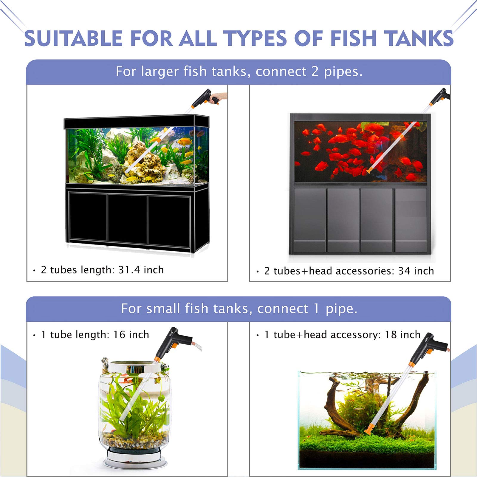 -【Wide Application】: Aquarium Vacuum Gravel Cleaner is suitable for various types of fish tanks, with spliced extension tubes, two-stage splicing combination, both large and small tanks are suitable, and extension tube can be installed according to demand.Four basic combinations(excluding handle length):2 tubes(31.4inch);2 tubes + head(34inch);1 tube(16inch);1 tube + head accessories(18inch).