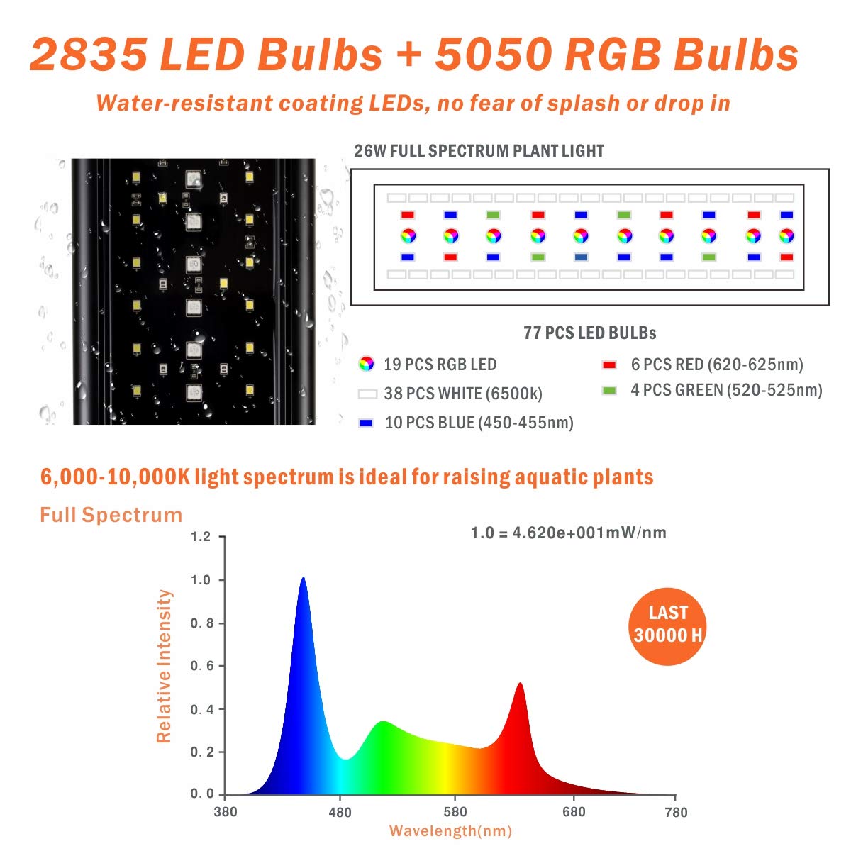 -Sunrise & Sunset Functions - enable the LEDs to be easily programmed to slowly turn on or off in 15-minute which prevents light shock to fish. The white daylight mode blends the white, red, green and blue LEDs together to produce bright light. Moonlight mode provides 6 single-colored ( red, purple, blue, cyan, green, yellow) and 10 levels dimmable options. 1 programmable preset can save customized color combinations and lighting