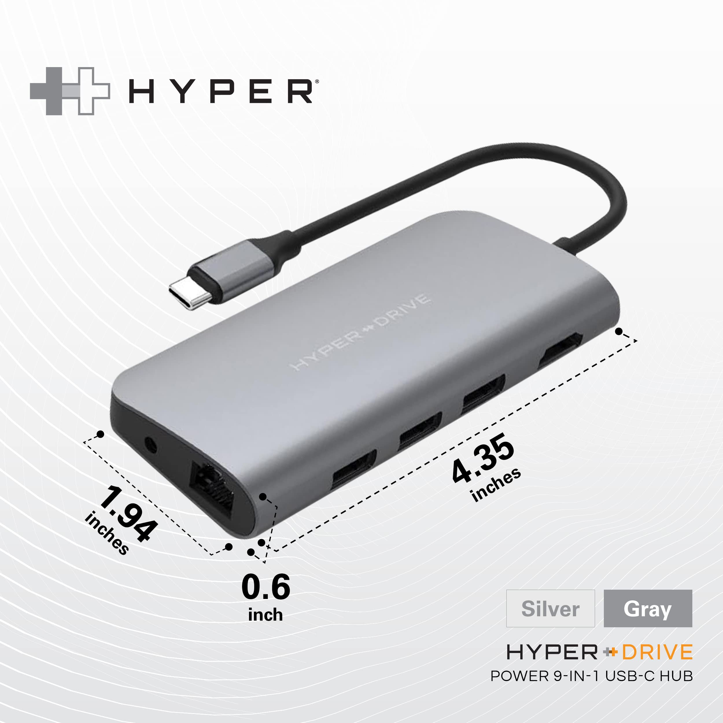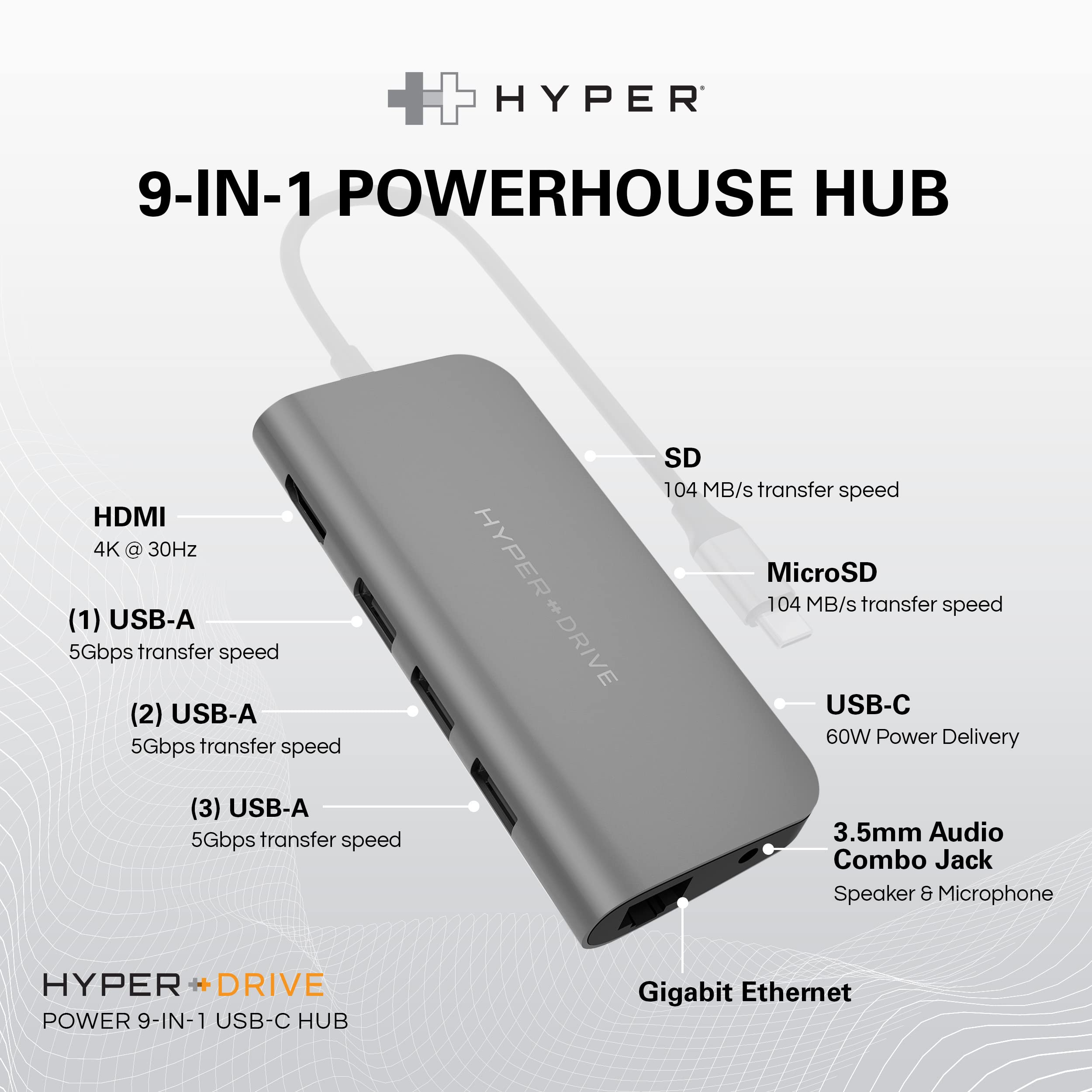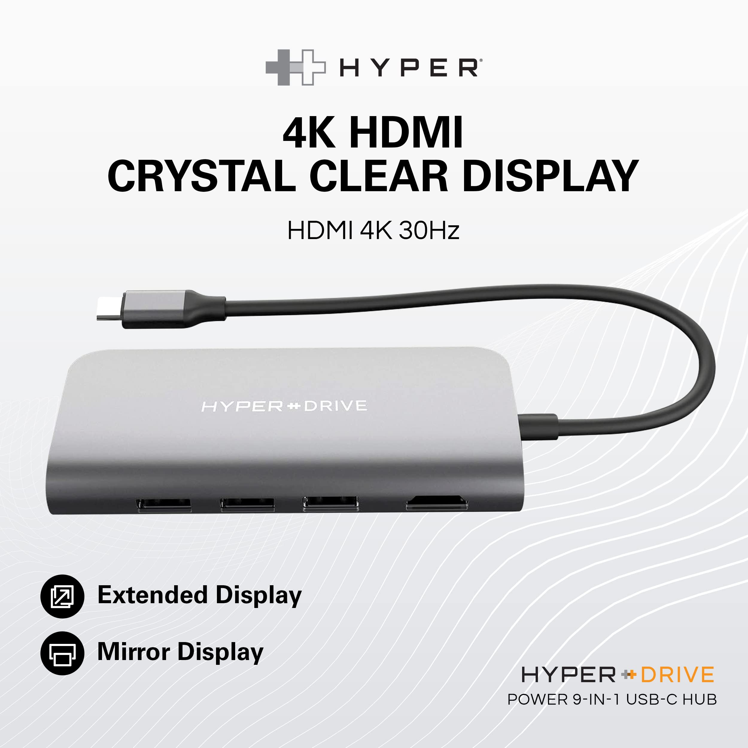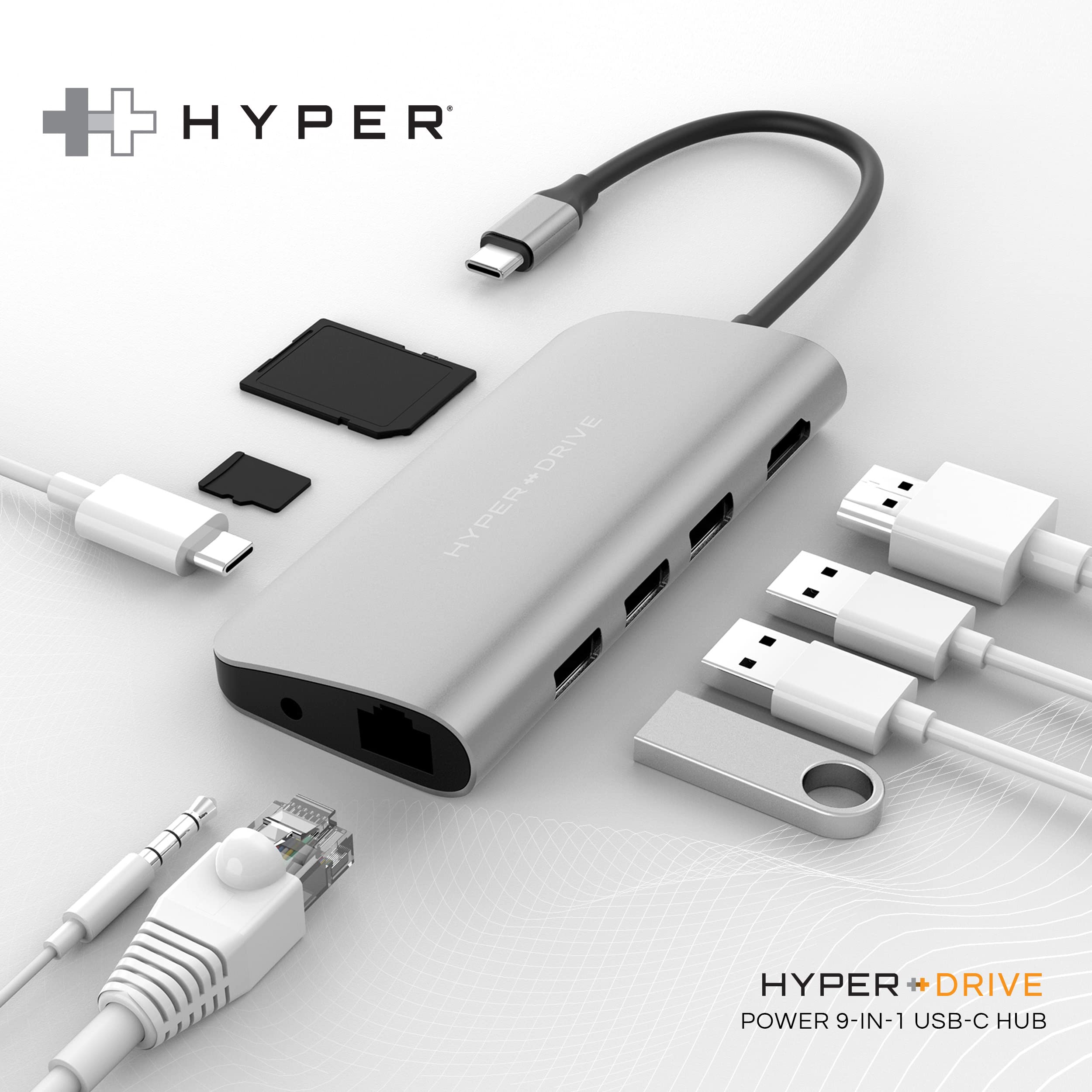 HyperDrive USB C Hub - Hub USB 9 en 1 para computadora portátil con 4K HDMI, Ethernet, 3.0 USB-A, USB C PD, MicroSD/SD, conector de audio - Compatible con iPad, MacBook, Chromebook, Windows - Gris espacial