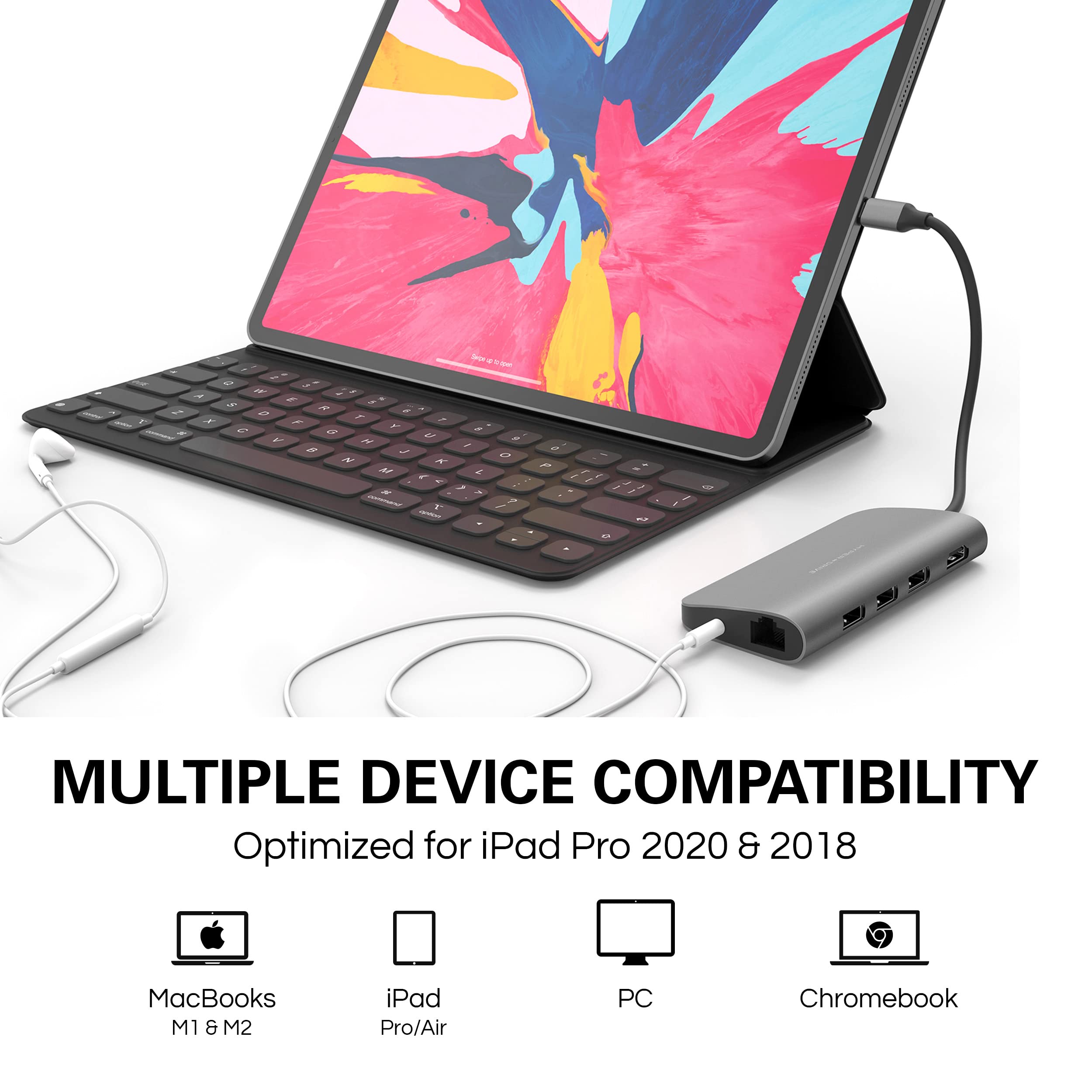 -Compact and Portable Design: Slim and powerful, this USB C charging hub adapter for MacBook Pro/Air, iPad Pro/Air, Chromebook, and Windows PC eliminates the need for multiple adapters.