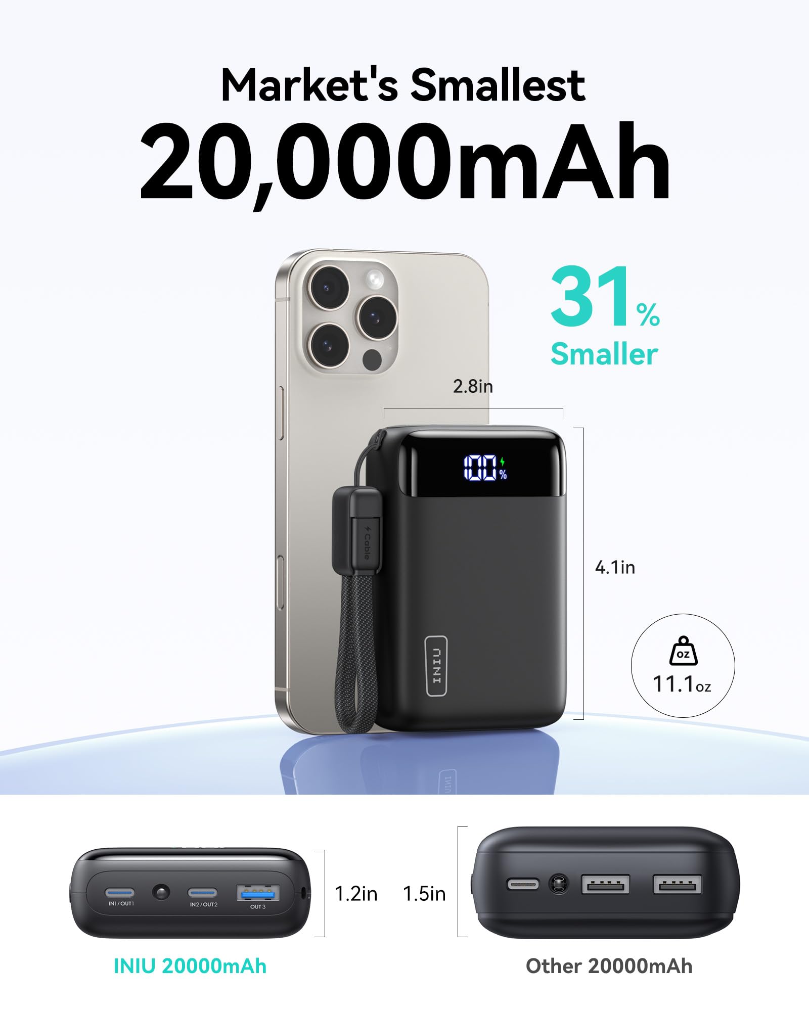 INIU Cargador portátil, el más pequeño 22,5 W 20000 mAh USB C entrada y salida Power Bank carga rápida, PD 3.0+QC 4.0 pantalla LED batería de teléfono compatible con iPhone 17 16 15 14 Pro Samsung S24 Google iPad, etc.