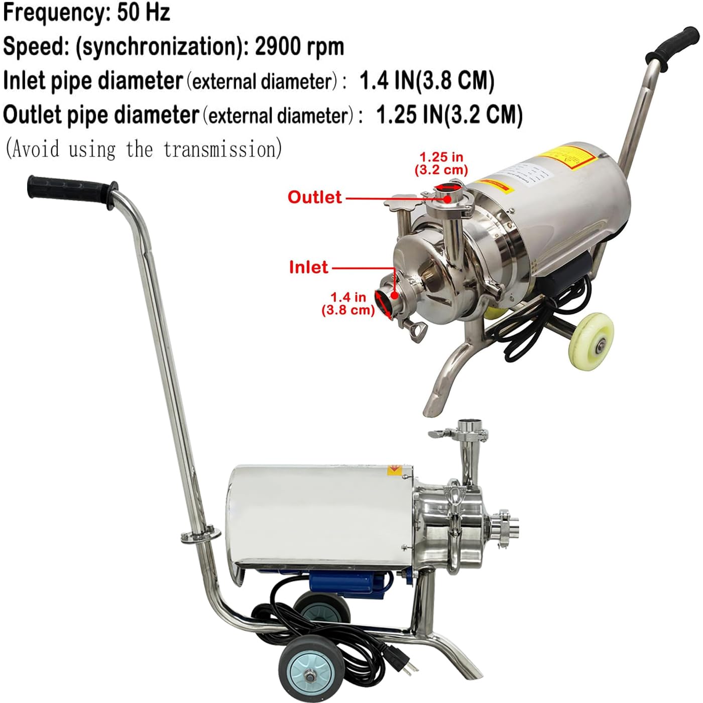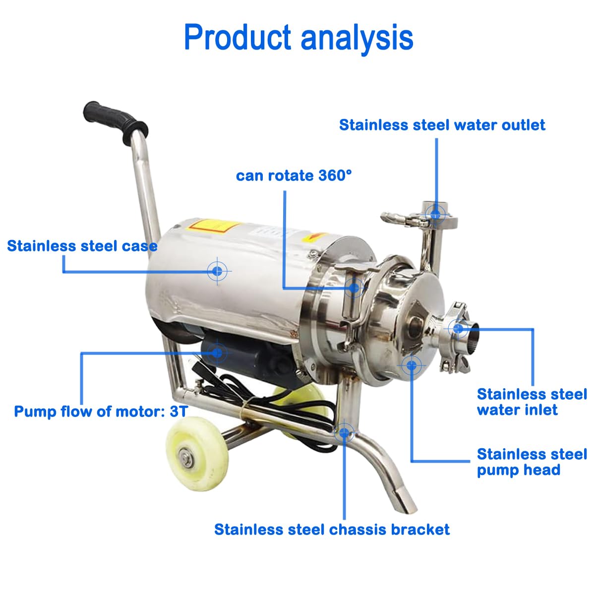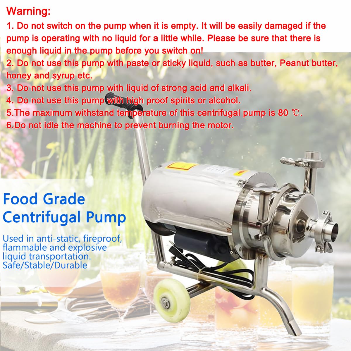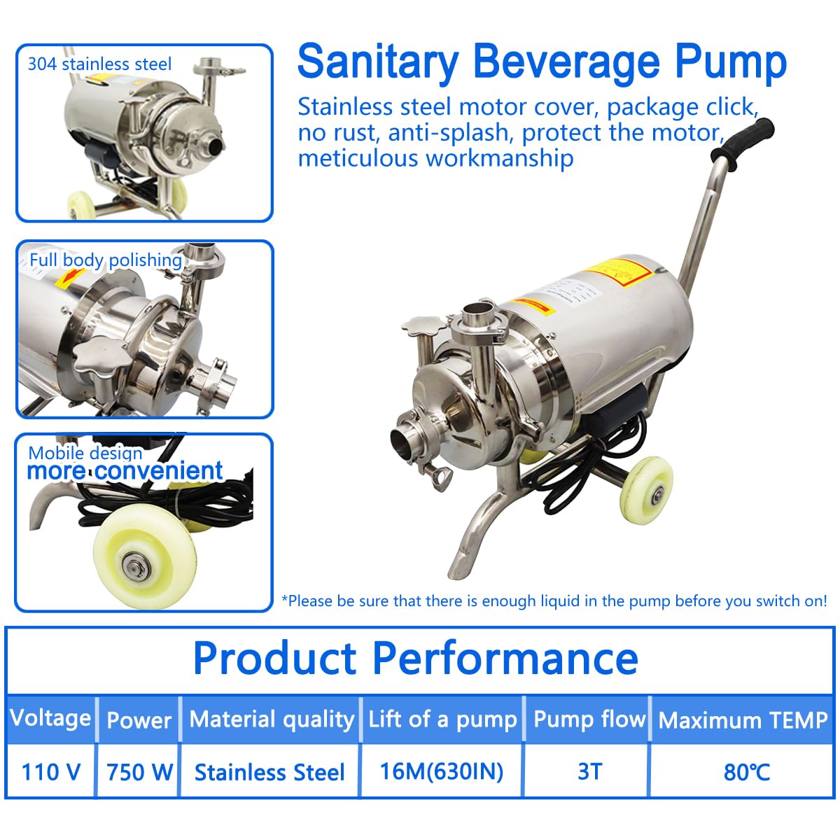-[Features] Material quality:304 Food grade stainless steel.The impeller has strong power, pressure resistance and deformation resistance.The food grade pump has handles and removable wheels and chassis for mobility