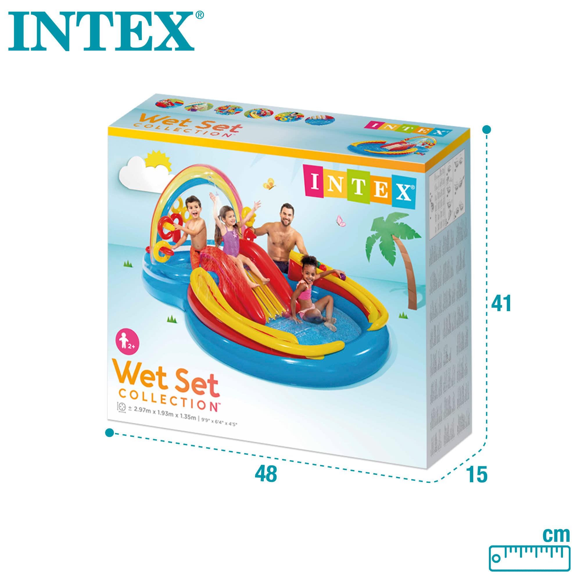 Intex 57453EP Piscina inflable para niños con tobogán acuático y lanzamiento de anillos, tobogán arcoíris multicolor de 9,75 pies x 6,3 pies x 53 pulgadas, para niños de 2 años en adelante