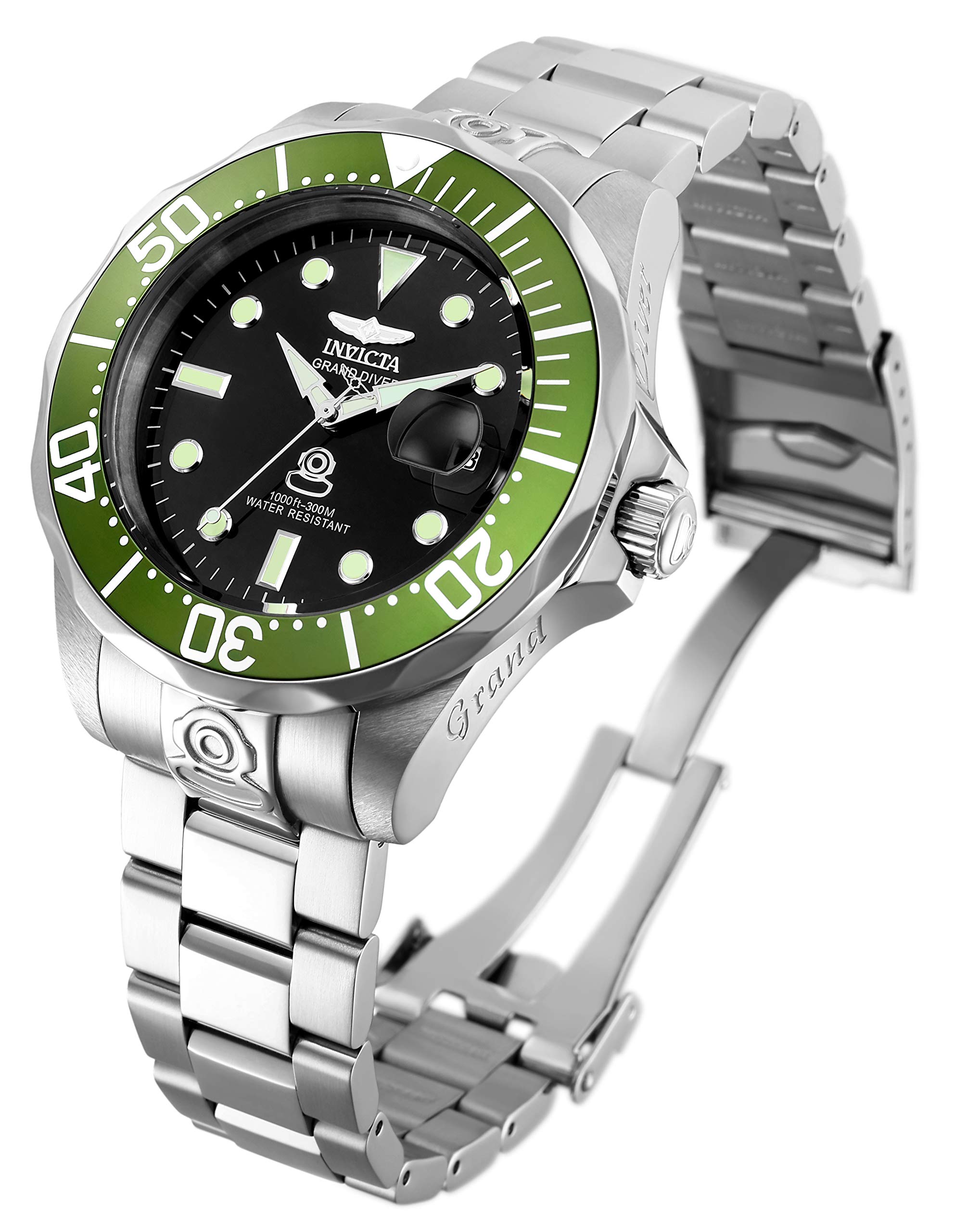 -Mineral crystal; Screw-down crown; Unidirectional stainless steel bezel with green top bezel ring; 300 meter water resistant: Suitable for professional marine activity and surface water sports. Suitable for diving.