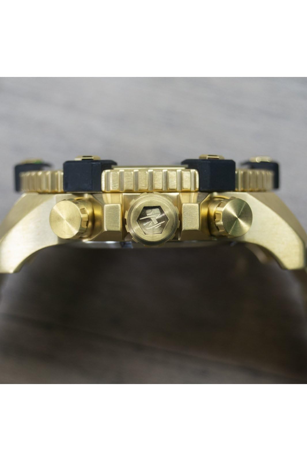 -Gold tone stainless steel case 56mm diameter x 19mm thick; Exhibition case back; Black dial; Luminous hands and hour markers