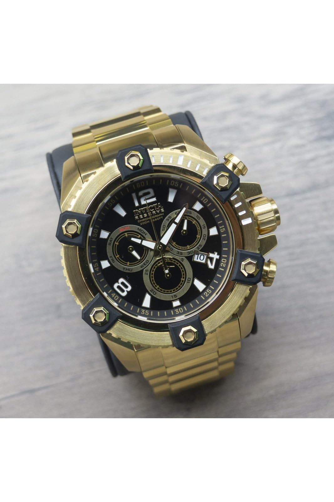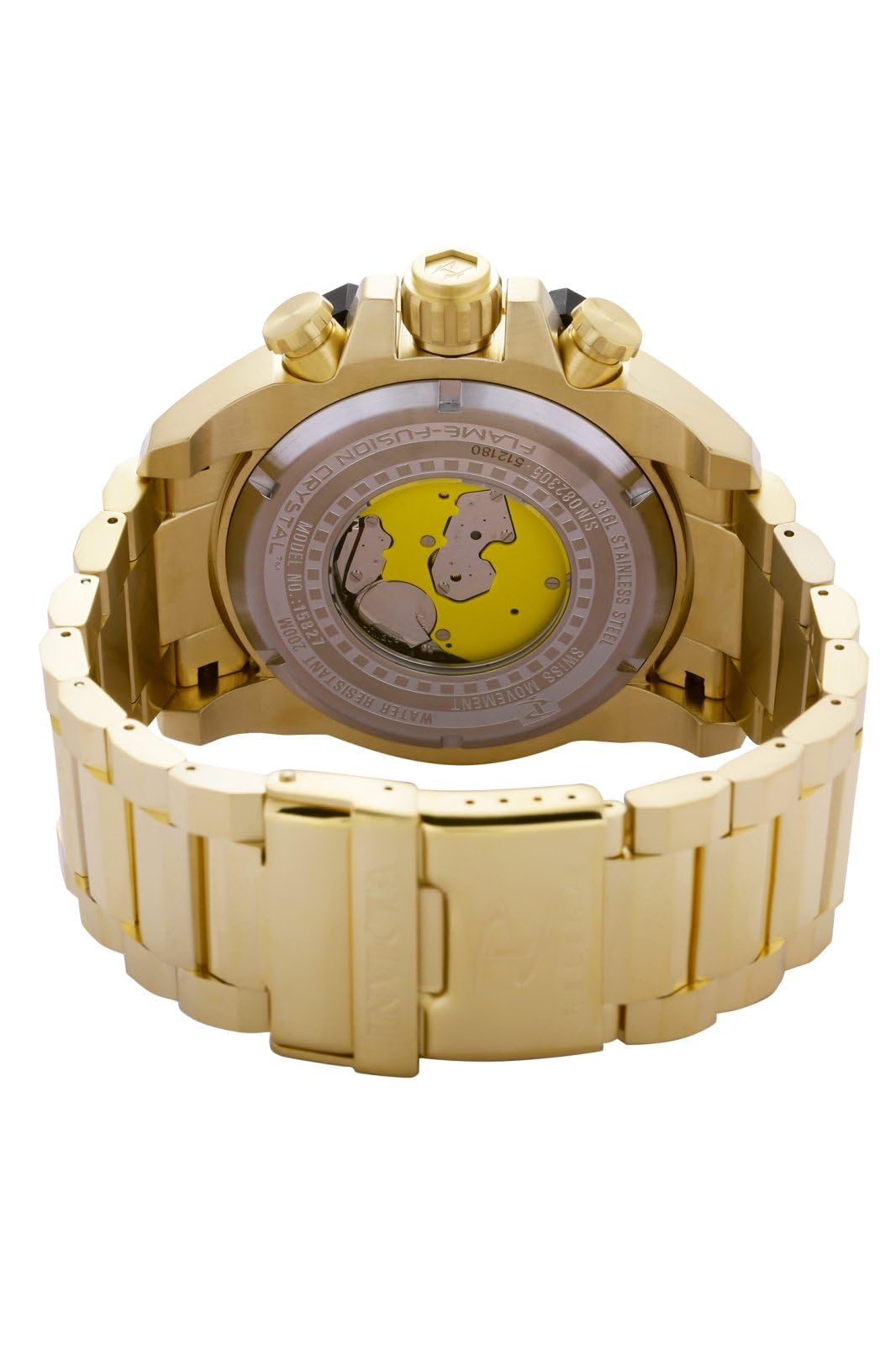 -Flame Fusion crystal; Push/pull crown; Uni-directional gold tone stainless steel bezel; Functional Subdials: 30min, 60sec, Day; 200 meter water resistant: Suitable for professional marine activity and surface water sports. Suitable for diving.