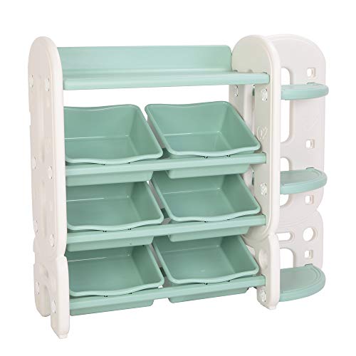 - Organize Your SpaceThis 2-in-1 toy storage organizer allows for optional storage and for displaying all types of toys, books, dolls, and children's accessories. It fits seamlessly into the baby's room and always keep the necessities at hand. - Sturdy and Durable Not made of junky wood, the sturdy plastic frame stands up to your teething baby who wants to bite or pull up on everything. Made of HDPE material while rounded edges design for safety also offers easy-access storage space for toys and more. - Large Storage Capacity This storage shelves includes a sturdy base plus 6 open-front tote bins. The tray are tilted for easy access and the bars do not bend or drop the bins out easily. Kids can easily grab the contents of any bin with this opening storage design. They are ideal for storing toys. - Easy to Assemble This kids toy storage can be easily installed and disassembled, no harmful parts, no screws. No need other tools, it can be easily assembled by using the screw or a coin instead of the screwdriver. You can use the screw as a tool to tighten the other screws. - Ideal for All Storage Needs This set consists of an organizer and a corner rack. Youll have plenty of organization and storage space for kids' toys, books, and more. The corner rack can go on either side, flexible use of space, you can decide how to assemble them together according to your preferences or room layout.