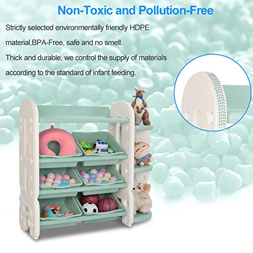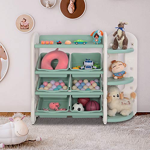 JOYMOR Organizador de almacenamiento de juguetes para niños con contenedores, estantes de juguetes para niños, estante de esquina, estante de plástico de varias capas para niños pequeños para la sala de juegos del dormitorio de los niños (verde)