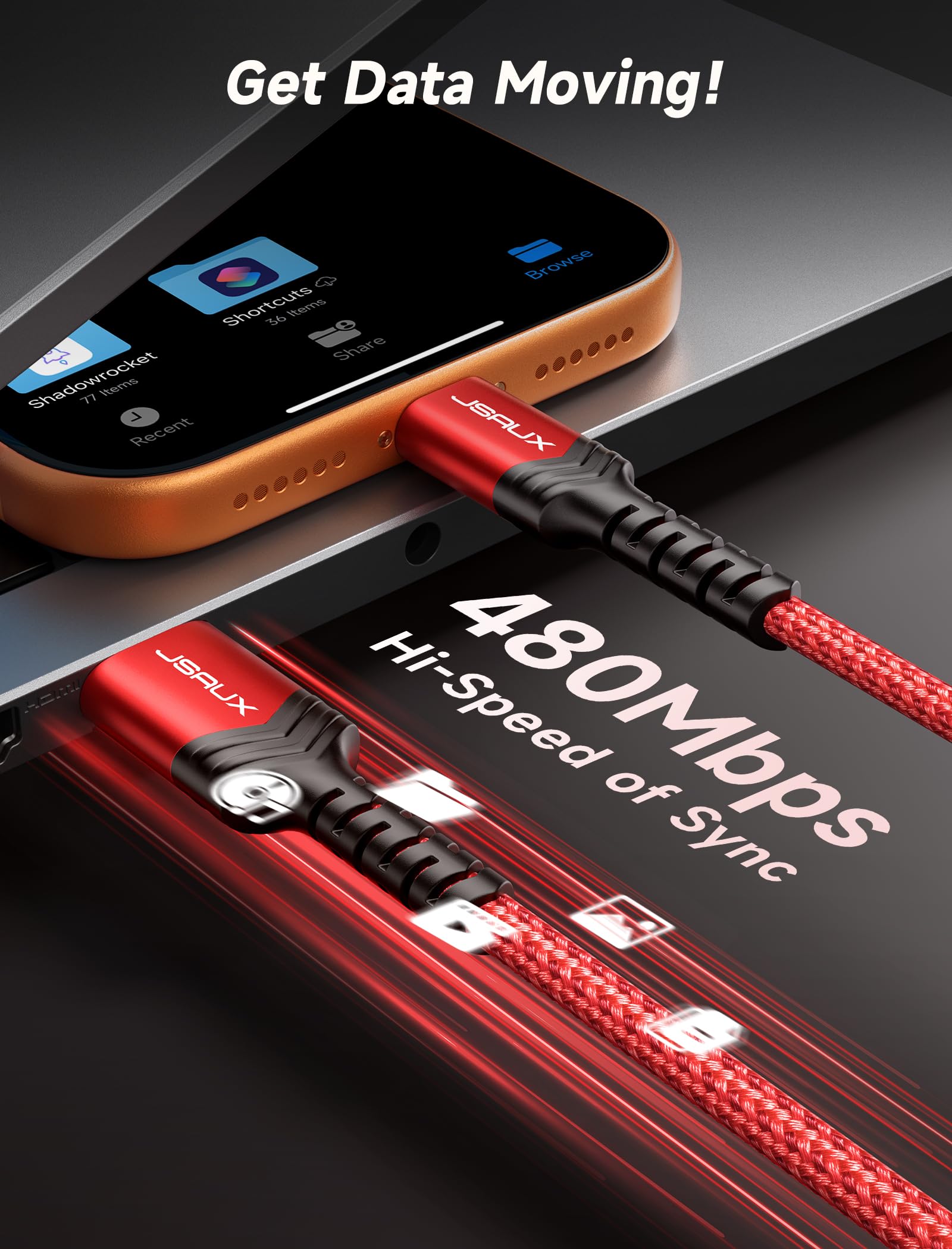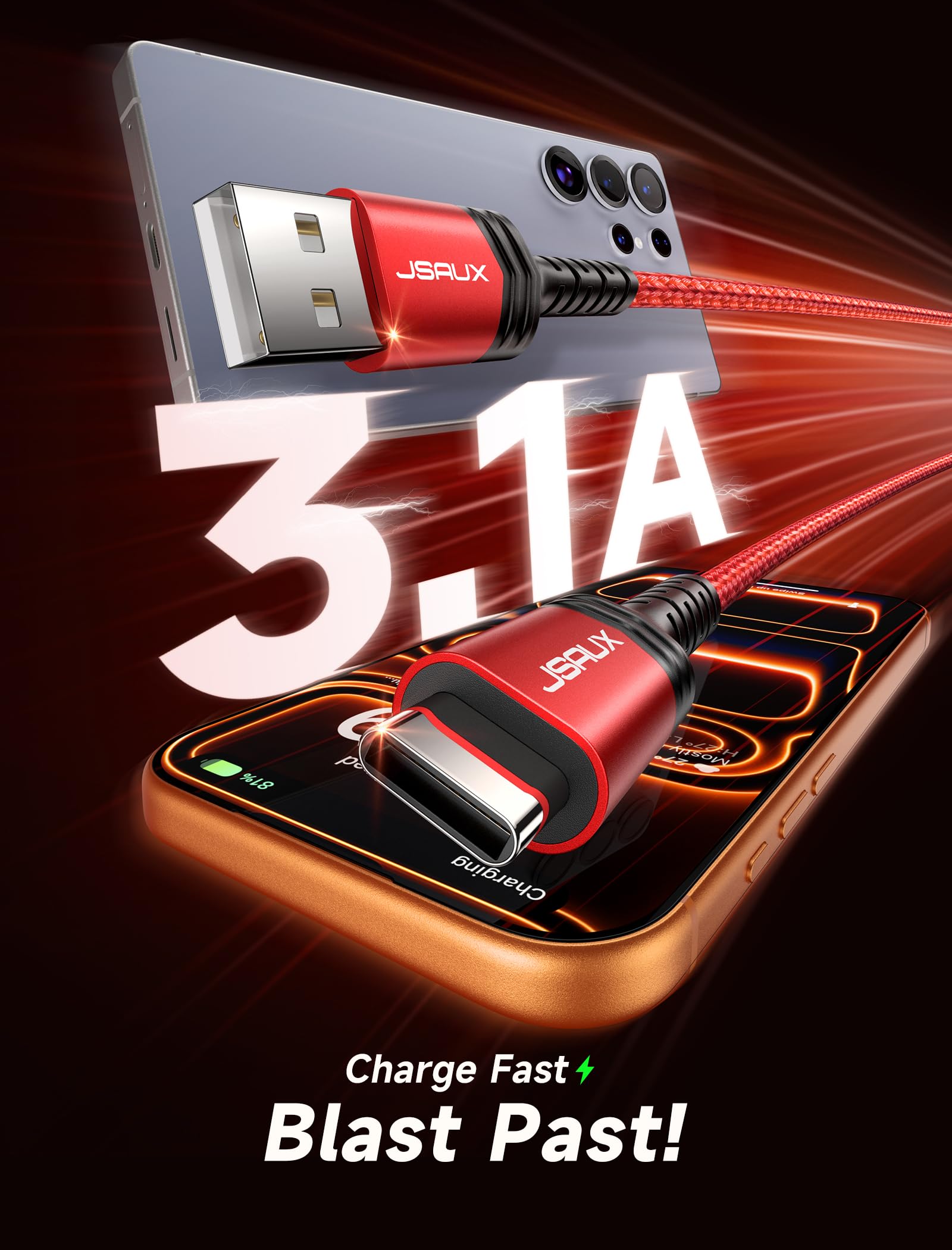-3.1A Fast Charging and Sync: 3.1A Fast Charge, Transfer speed can reach 40~60MB/S (480Mbps), JSAUX USB C Cable Accelerate the speed by delivering 5V/3.1A safe charging power (25% faster) compared with other cables which provides 5V/2.4A current.