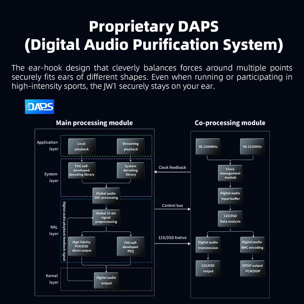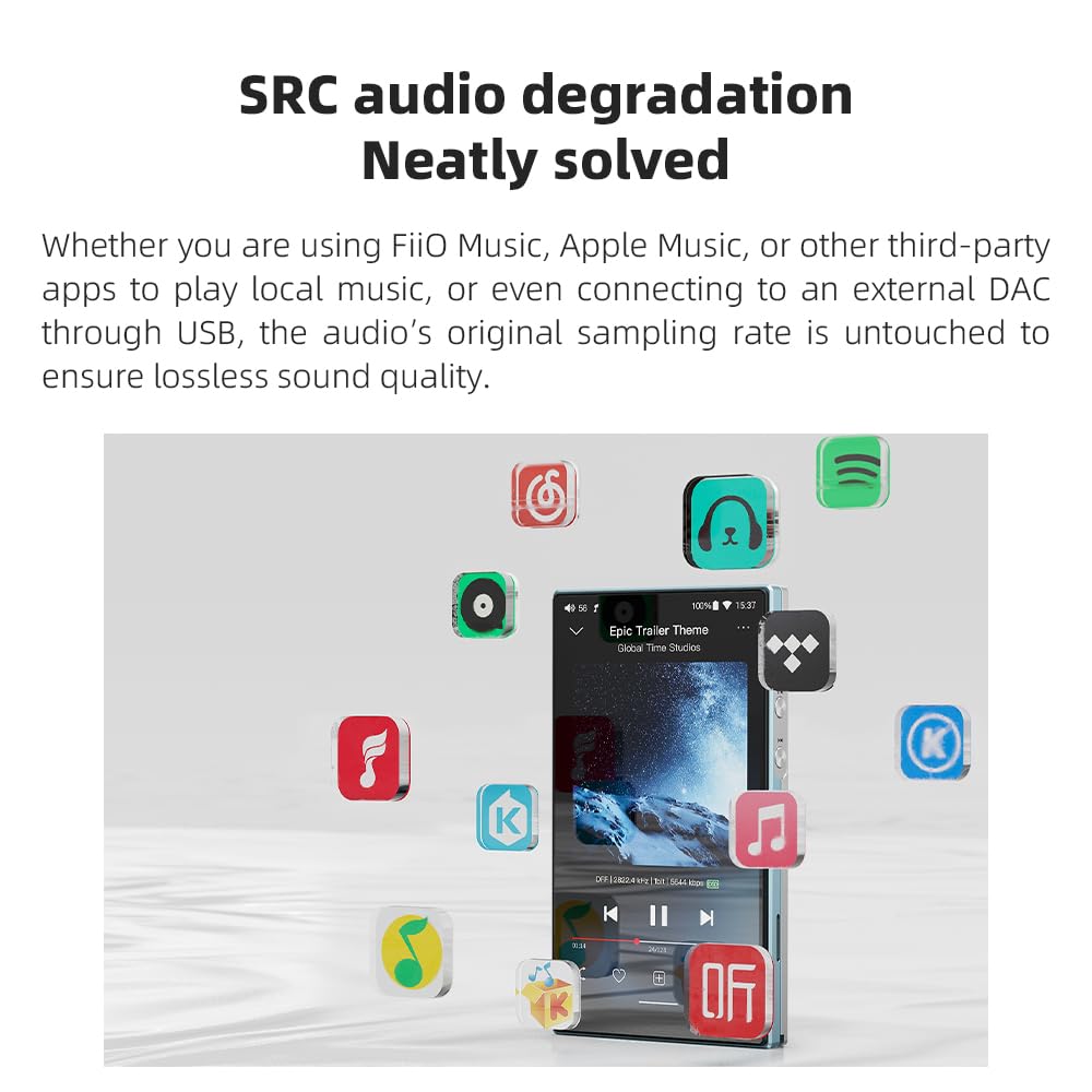 -The self-developed DAPS digital audio purification system, coupled with a fifth-generation FPGA and custom dual femtosecond crystal oscillators, ensures that both local playback on third-party music apps like FiiO Music and Apple Music, as well as output to an external USB DAC, maintain the original audio sampling rate. This guarantees lossless audio quality for a pristine listening experience.