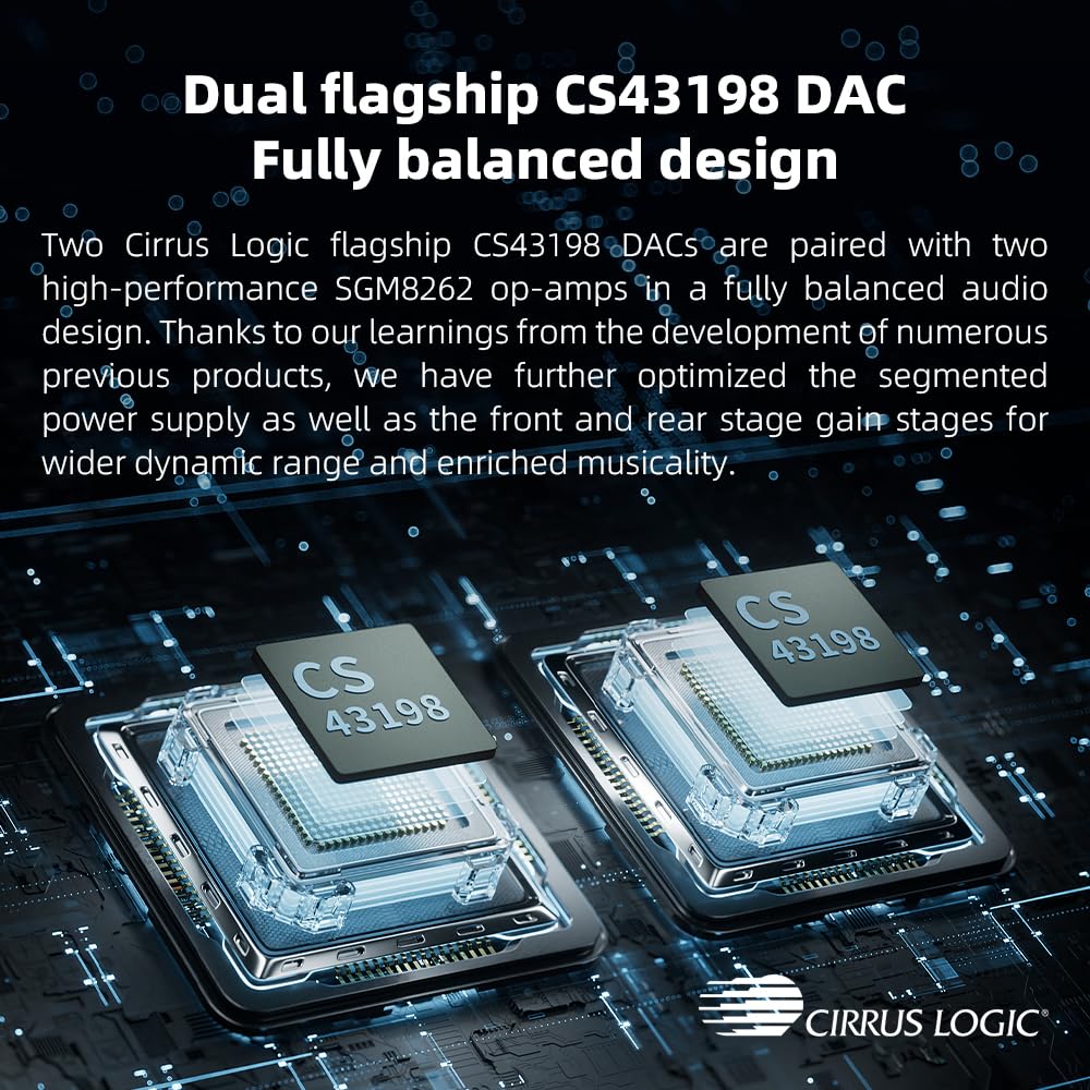 -Dual flagship DACs, CS43198, with a powerful 700mW output drive: The JM21 features a fully balanced audio architecture, powered by two flagship Cirrus Logic CS43198 DACs paired with two high-performance SGM8262 operational amplifiers. Through audiophile-grade circuit design and tuning, the JM21 delivers a balanced output power of up to 700mW + 700mW, offering powerful drive and exceptional sound quality. It effortlessly powers headphones or large over-ear models with ease and authority.