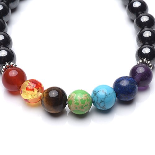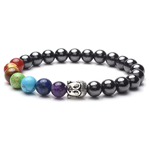 Specification:Material:Chakra beads include: Amethyst, Dyed Lapis Lazuli,Synthetic Turquoise, Synthetic Emperor stone, Tiger eye, Synthetic Amber, Natural Red agate. Beads Diameter:8mm, Length:7 Inches. Luxurious, Elegant Hematite Healing Bracelet This meditation bracelet is ideal for anyone who wants to heal their mind, body, and spirit. Perfectly tailored for the yogi on-the-go, busy mother or father, and anyone seeking stress-relief. Earth Therapy brings an excellent stylish solution in this tranquil hematite bracelet. Whether you are new to meditation, yoga, or natural healing, or you are a seasoned pro, integrating hematite into your routine brings balance to your life.Why Hematite?The gemstone hematite is thought to bring inner peace, resolution, and meditative strength while dissolving negative energy and thoughts into love. This sleek black stone has been used for centuries as an alternative to medicine as a holistic health solution. This history dates back to ancient Egypt, when it was used as a tool to remove toxins from the body.Hematite is also known to balance root Chakras. Maintaining a healthy root Chakra is important in maximizing life energy, endurance, rhythm, and connection to nature. Placing hematite directly on the skin is ideal for maximum benefits, making a bracelet the perfect solution.The Perfect GiftOur Buddha Root Chakra Bracelet, made with premium hematite stones, comes in a luxurious Gift Box and JOVIVIV velvet pouch making it the perfect gift for Mothers Day, Fathers Day, Valentines Day, birthday, Christmas, or any other holiday you need a thoughtful, unique gift for a loved one!Bring balance to your life with your Premium Hematite Bracelet - order today!Jewelry Care Knowledge:1. Remove Jewelry during Sports and Shower 2. Keep Jewelry Away from Liquid Goods like Perfume, Swimming Pools and Spas