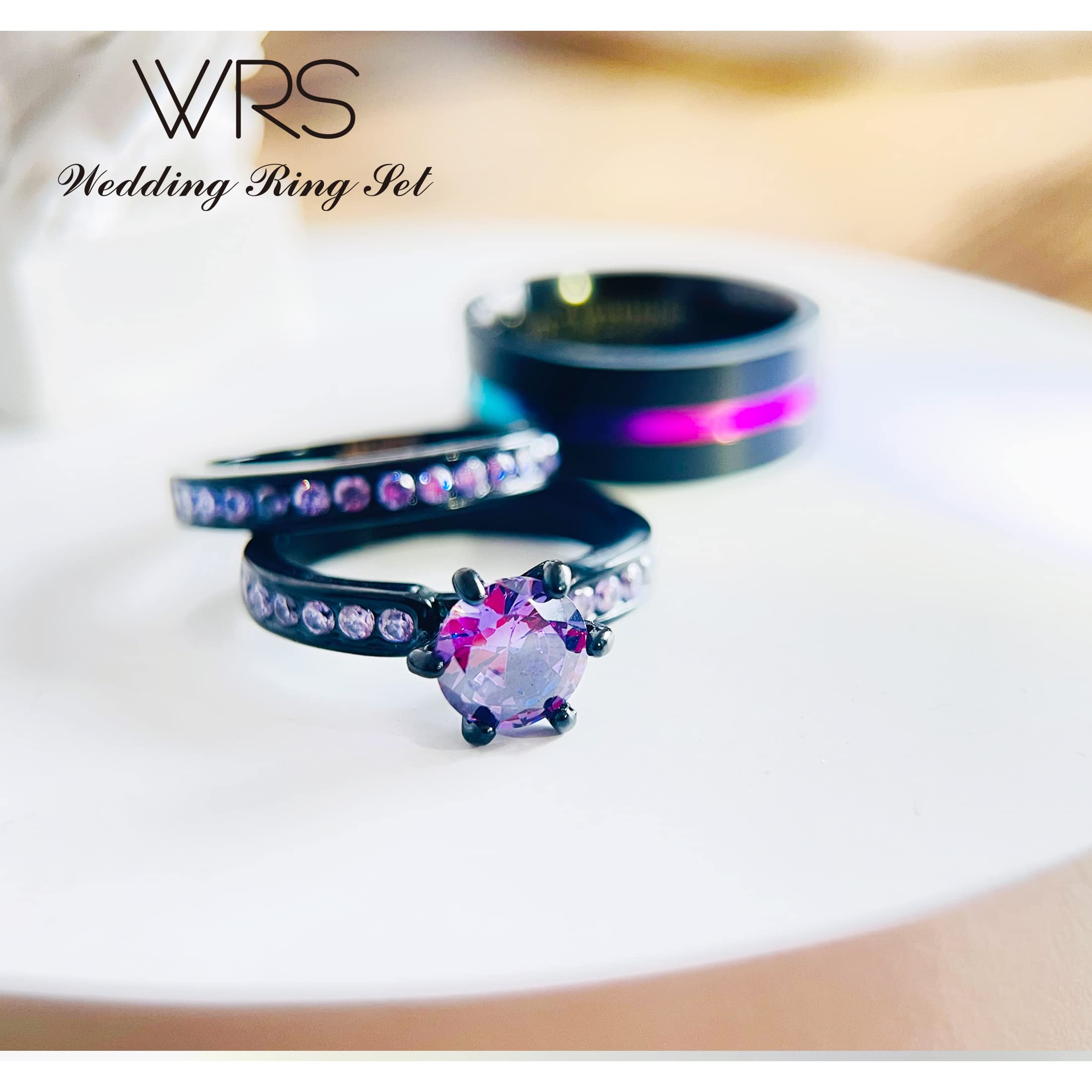 Conjuntos de anillos de boda para él y ella, anillos a juego para parejas, anillo de compromiso de boda con circonita cúbica violeta y relleno de oro negro de 18 quilates para mujer, conjuntos nupciales y alianza de boda de carburo de tungsteno para hombr