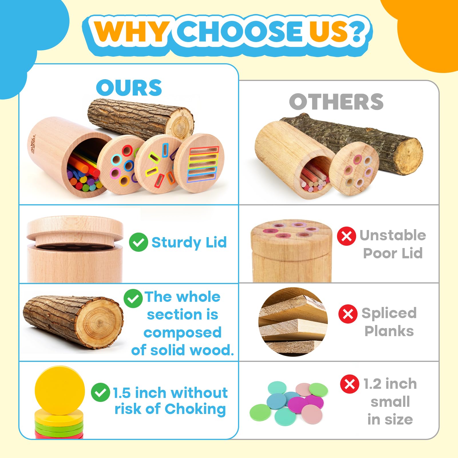 -【Safe and Child-Friendly Design】:The natural beech wood, sourced from Romania and Germany, undergoes a process of hollowing and fine polishing. The surface is coated with a food-grade, safety coating. The reliable wood craftsmanship ensures it can withstand active play by young children.. Edible children's paint, bright in color and not easy to fade. The toys are in international Montessori sizes, making them perfect for little hands but still thick.
