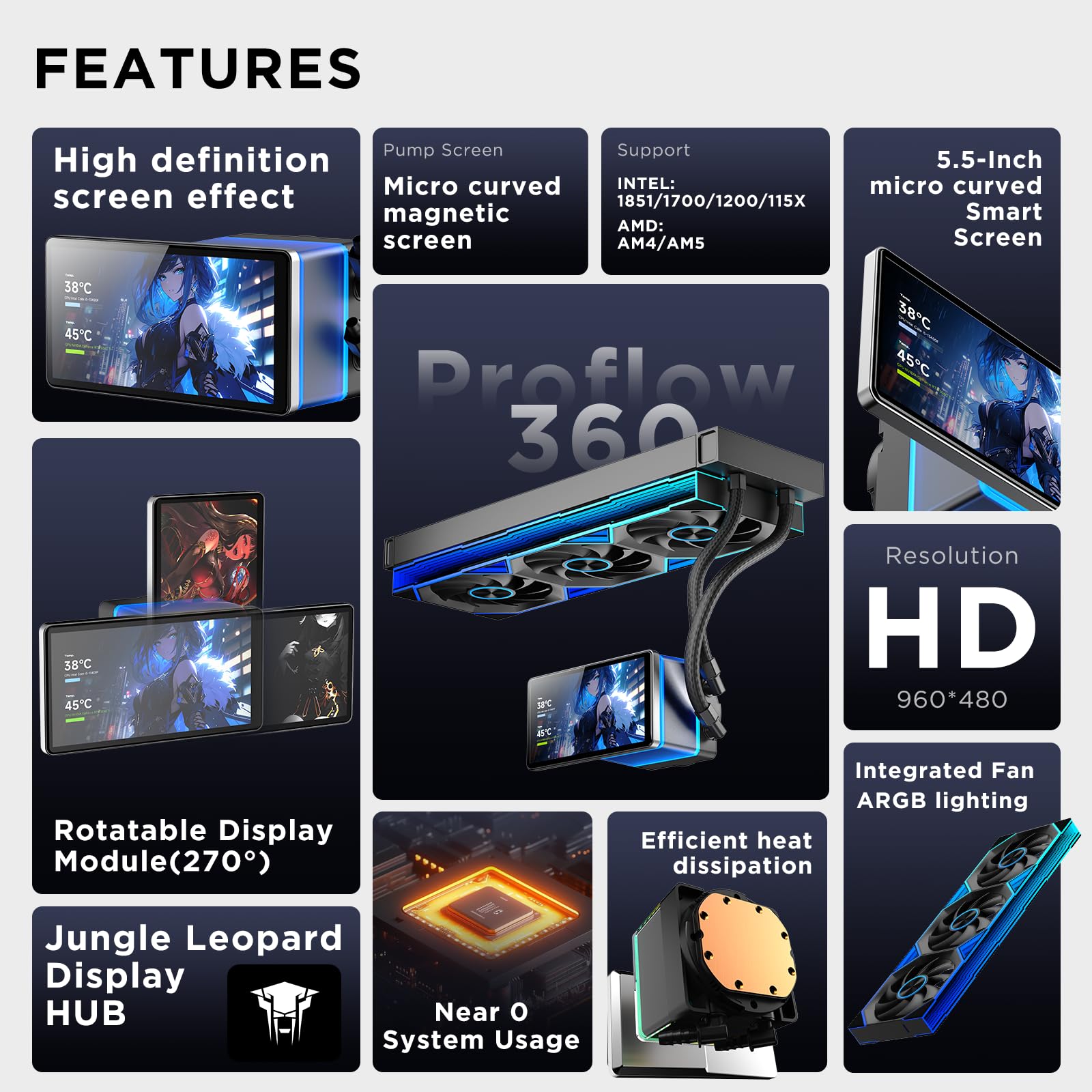 Jungle Leopard PF 360 CPU Water AIO Cooler Refrigeración líquida|Pantalla magnética LCD de 5,5 pu