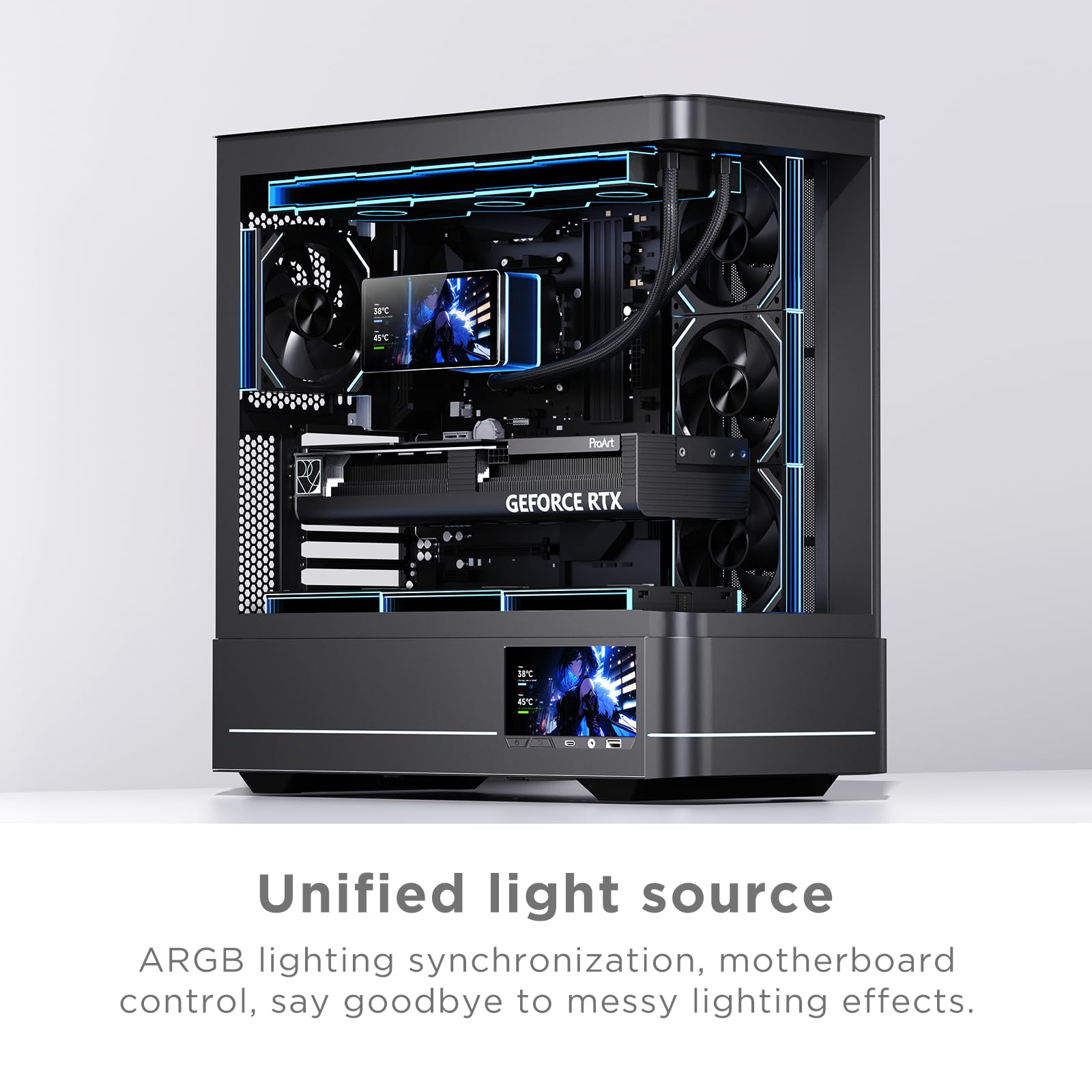 -[ARGB Synchronized Lights]Siamese ARGB Infinity Mirror fans and dual-ring ARGB water-cooling headers are synchronized with the 5V 3pin on the motherboard, and 1600W colorful soft-lighting effects create cool visual effects. Transparent shell + dual halo surround, enhance the chassis value, realize the whole machine lighting effect unity