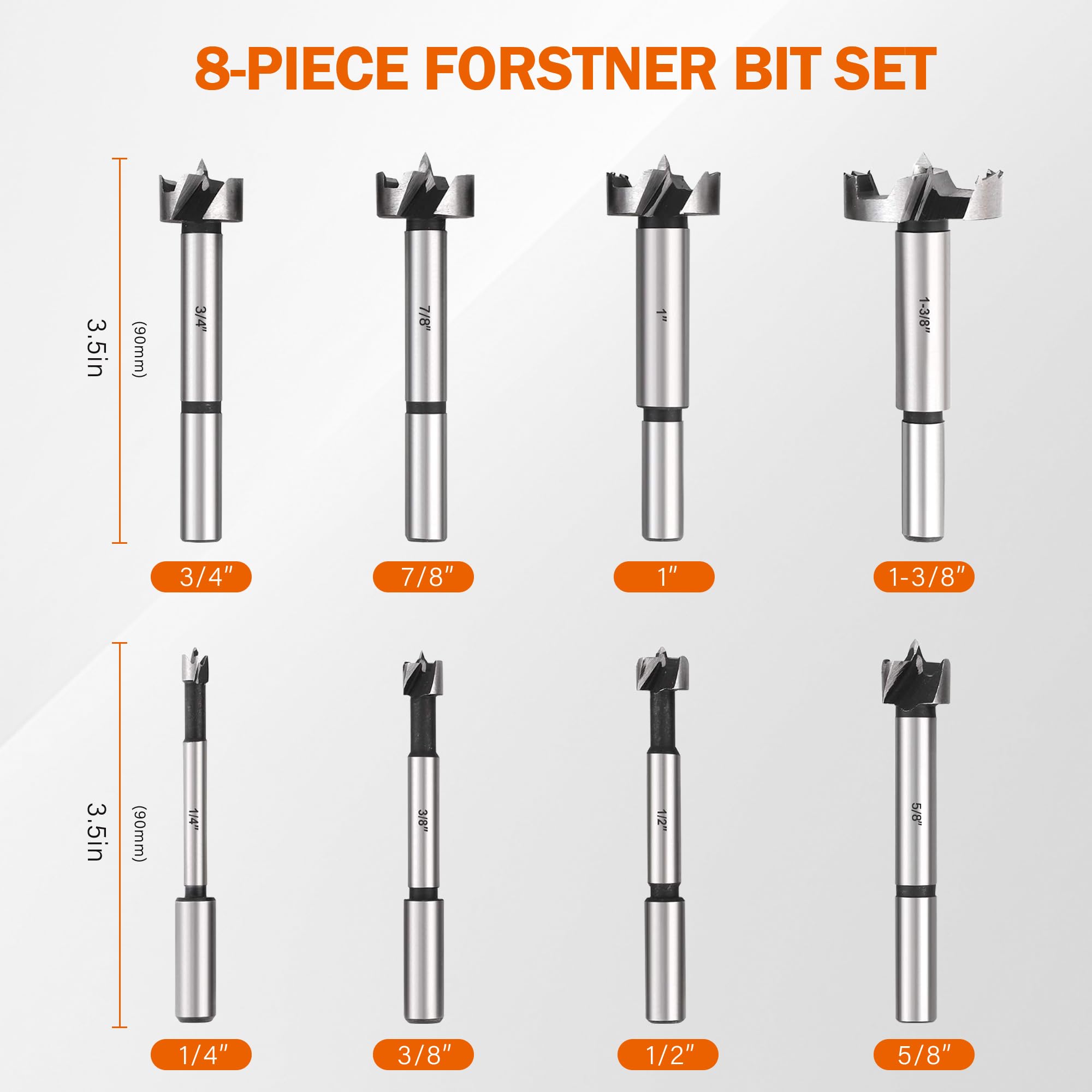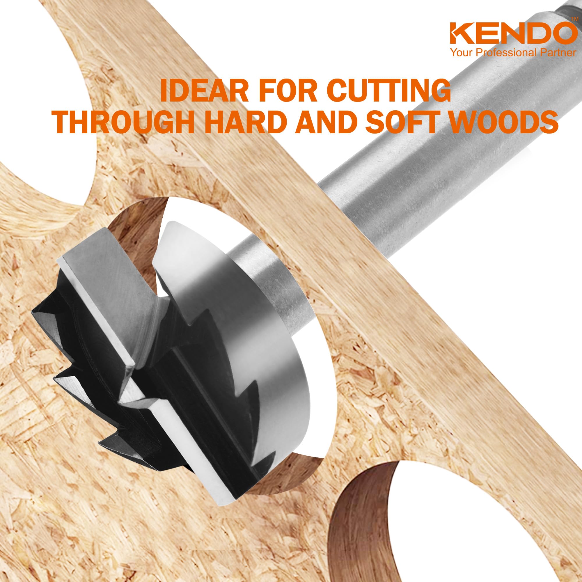 -SIZE: KENDO Forstner bit set includes: 1/4" (6.3mm), 3/8" (9.5mm), 1/2" (12.7mm), 5/8" (15.8mm), 3/4" (19.0mm), 7/8" (22.2mm), 1" (25.4mm), 1-3/8" (34.9mm) Forstner bits.