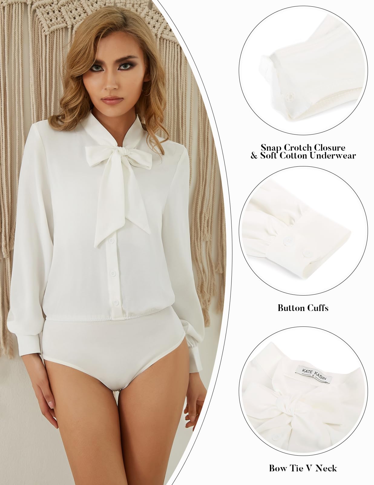 Kate Kasin camisa blanca con cuello y botones para mujer, mono de manga larga, blusa con pajarita, Tops informales elegantes para otoño 2025 XL