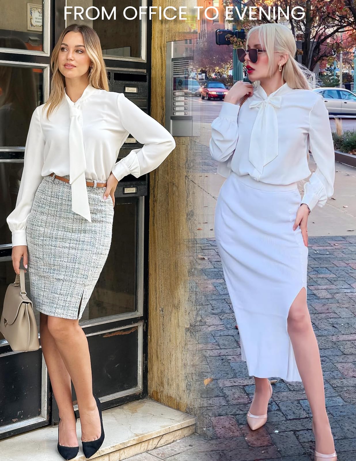-Trendy & Elegant Design: Bow tie v-neck collar, modest yet modern neckline. Regular fit silhouette, button up front, long sleeves with button cuffs