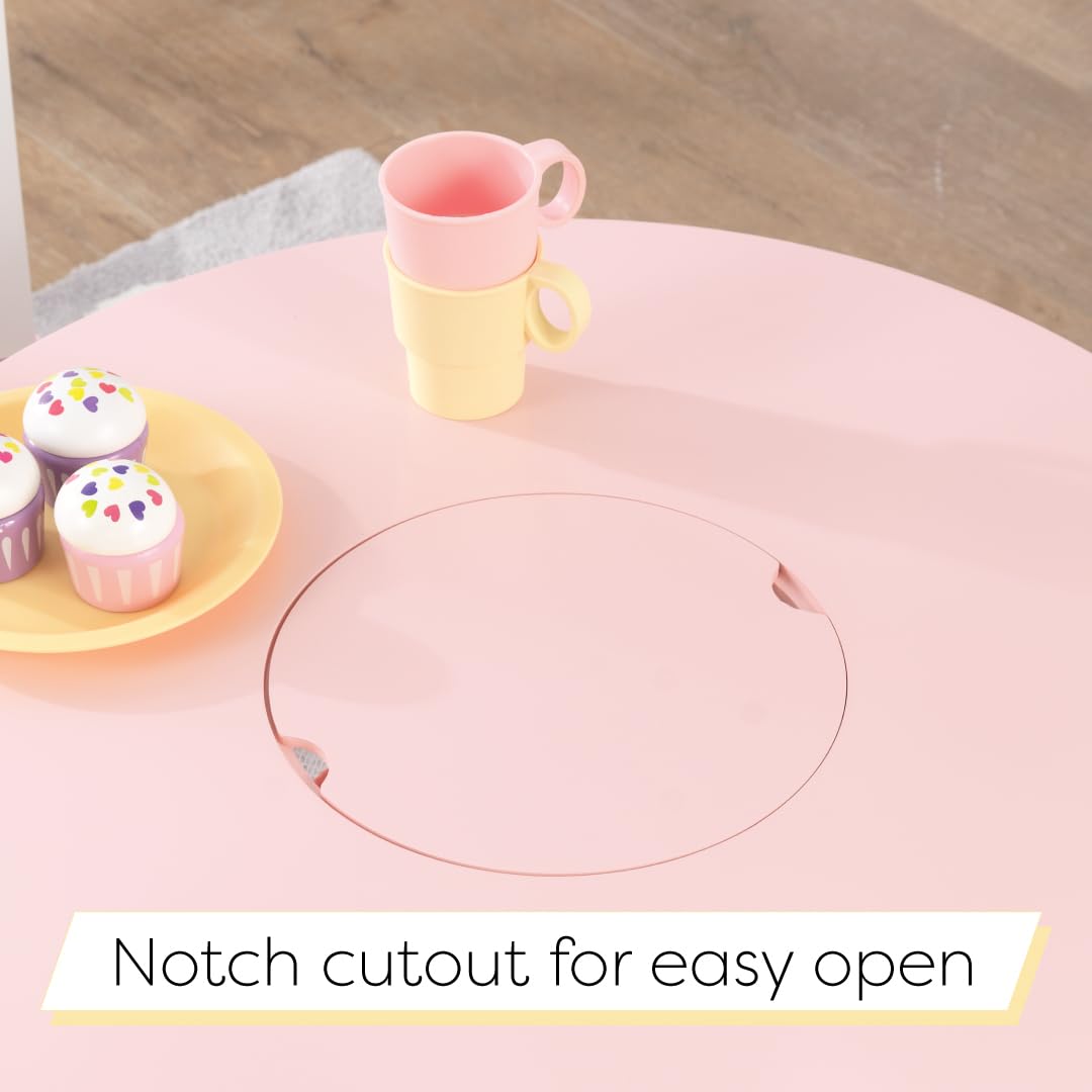 -HIDDEN STORAGE: The circle in the middle of the table lifts up to reveal an attached mesh bag for storage. Keep play food or dishes, art supplies, toys and more here! A notch in the circle makes it easy for little hands to open without pinched fingers.