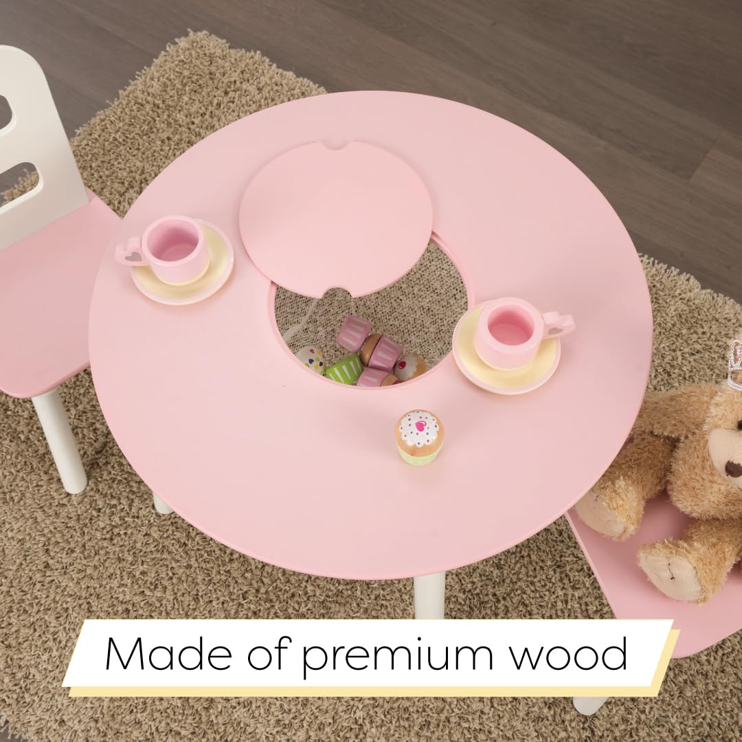 KidKraft Juego de mesa redonda de madera y 2 sillas con almacenamiento central de malla - Rosa y blanco