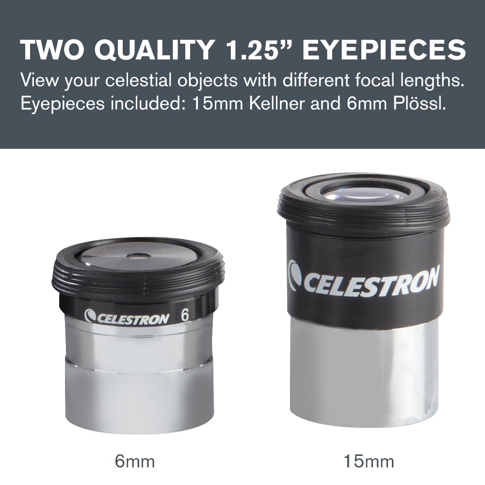 -TELESCOPE EYEPIECES PLUS MORE: Includes a 15mm Kellner eyepiece, a 6 mm Plössl Eyepiece, a 2x Power Lens with T-threads, 3 planetary filters (#80A Blue, #25 Red, Moon Filter), microfiber cloth, and foam-lined carrying case.