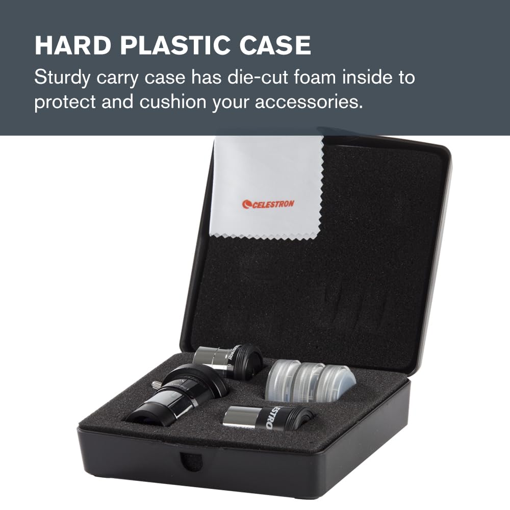 Celestron AstroMaster Kit de accesorios de filtro y ocular de 8 piezas: incluye dos oculares de 1,25", 2 lentes Barlow, tres filtros, paño de limpieza y estuche rígido negro