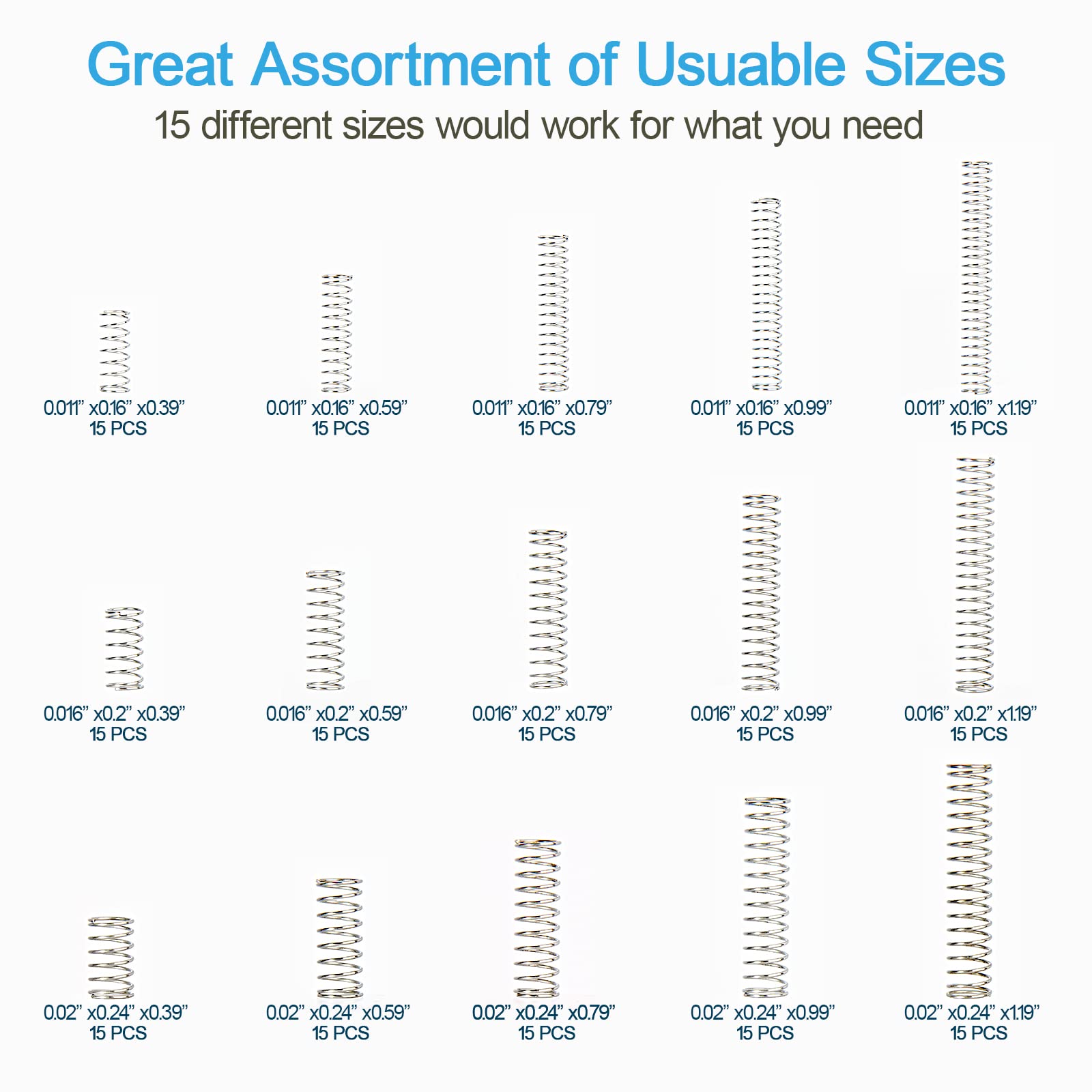Premium Steel:Made with real 304 steel that is both strong and rust-resistant, our springs are durable enough for a multitude of uses such as making pens, toys, or small home office tools Compact Box for Organization: Our premium spring kit comes in 15 sizes, enough to make any small office or home items. Keep your spring set organized during or after use with the included compact lock box High Quality: We have been manufacturing our springs for many years and stand by their quality. We offer a 24-month warranty. Rest assured knowing that if there are any issues with our spring sets we have 24/7 friendly, customer service willing and available to help