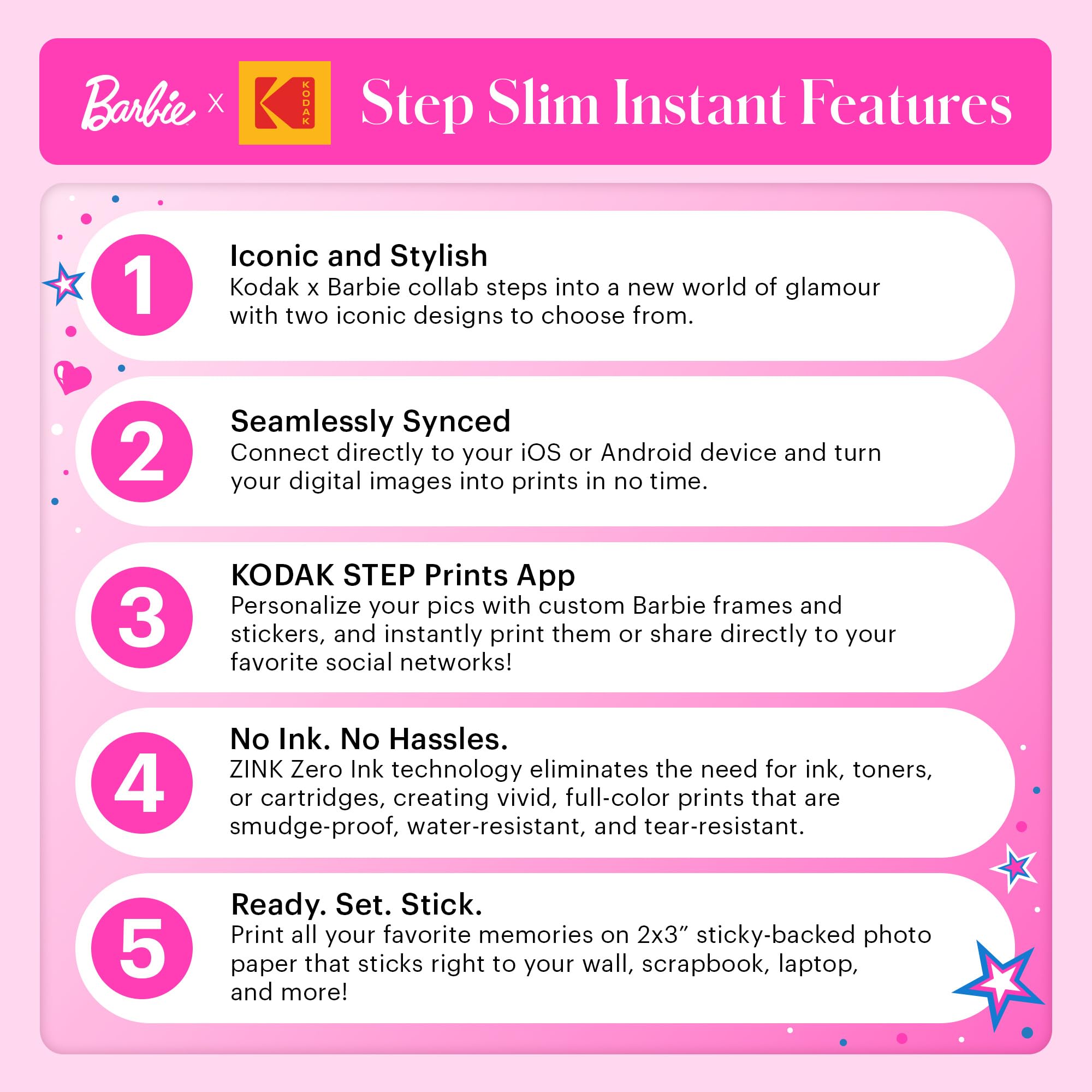 -PORTABLE PRINTING ON-THE-GO The BARBIE X KODAK STEP SLIM printer connects seamlessly to any iOS or Android device [via Bluetooth or NFC], so you can easily turn your digital images into prints.
