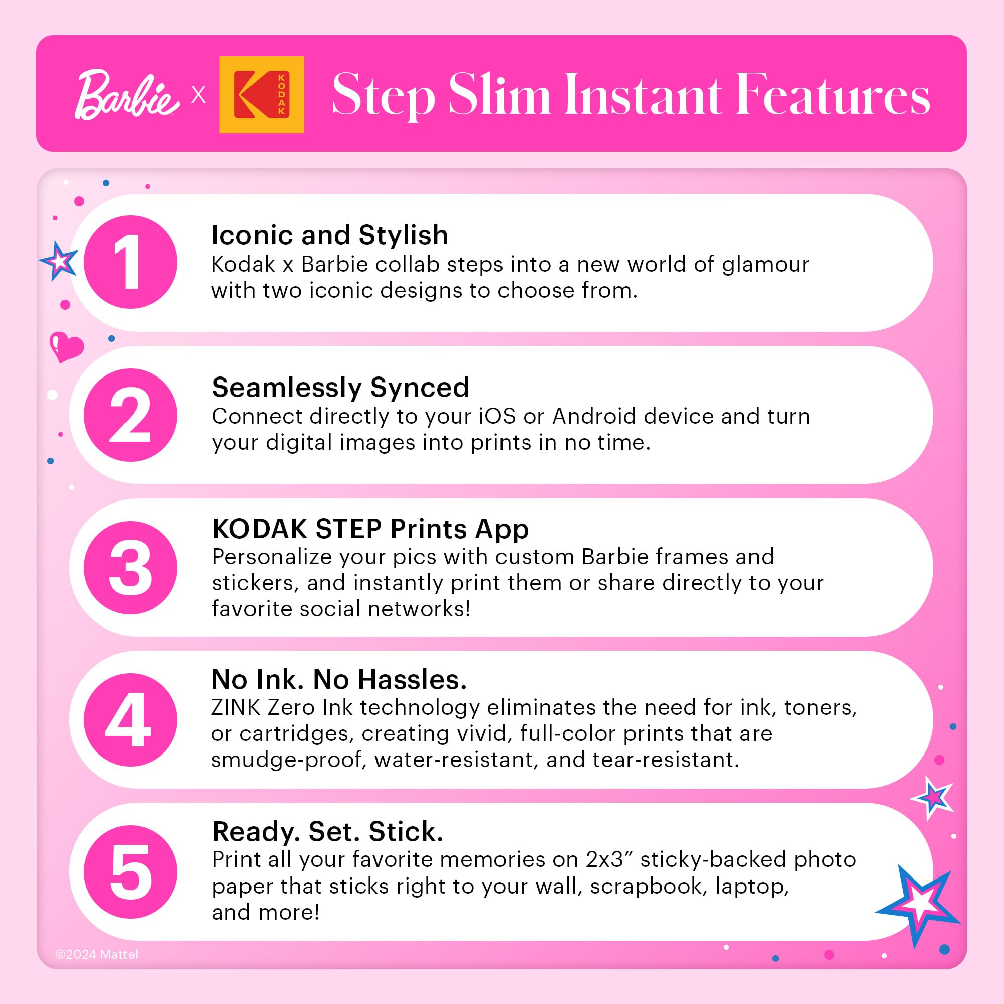 -BARBIE X KODAK: ICONIC AND STYLISH Step into a world of glamour with the Barbie x Kodak collaboration This chic lightweight pocket-sized printer prints up to 25 photos on a single charge.