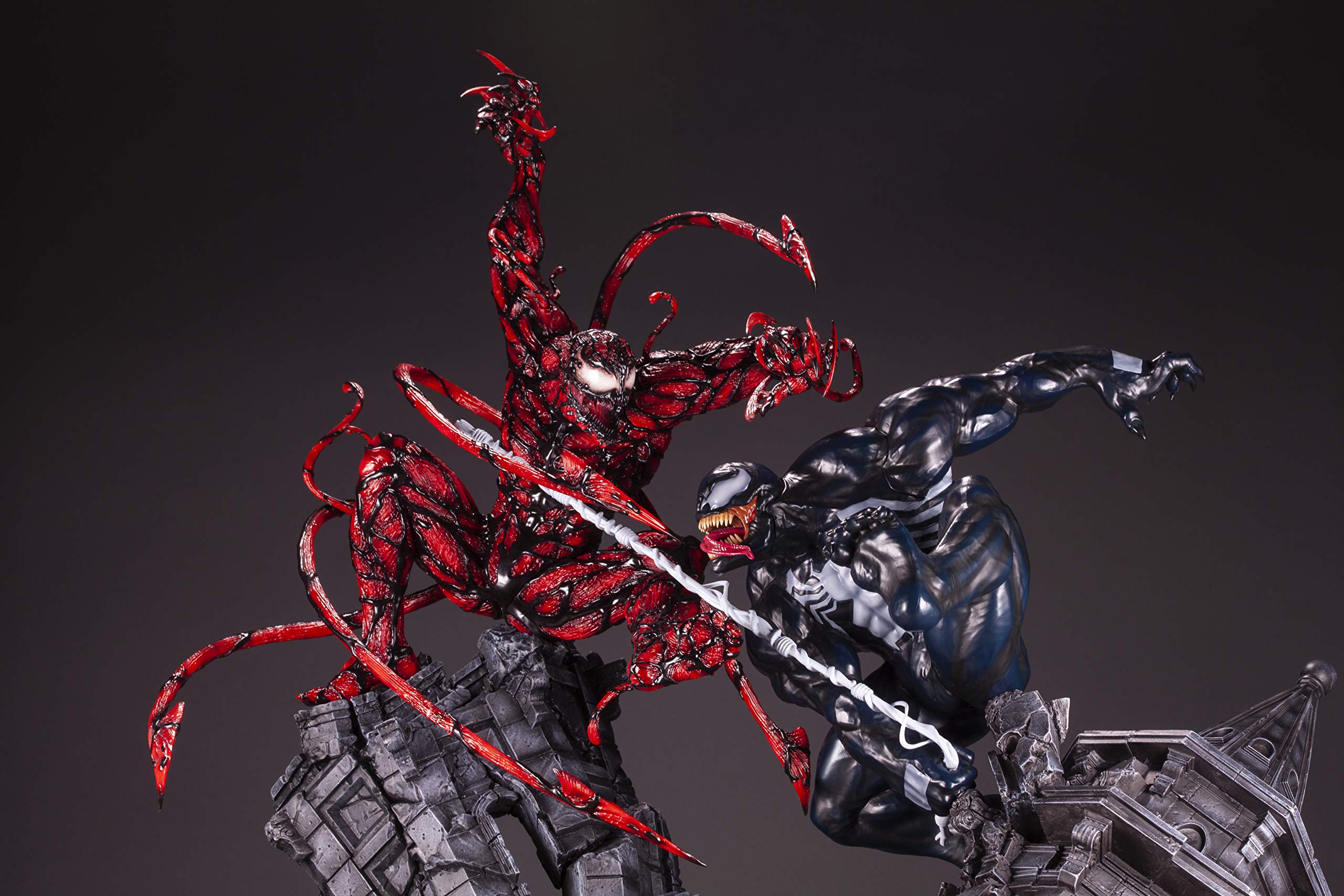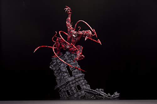 From Kotobukiya. The malicious and destructive Carnage from Spider-Man returns to the FINE ART STATUE line. The intense carving and details in the face of this creature are reproduced in the highest degree through cold cast and features a level of finish that greatly exceeds the last statue in the line! A deadly symbiotic attack from Carnage is fully recreated with the steel sharp tendrils emerging from its body. These five tendrils can be exchanged with normal symbiote tendrils included with this statue to recreate other various looks and poses. While this statue by itself is already full of impact, but by using the included expansion base, users can also attach ARTFX Venom to this statue to recreate the battle between the two symbiotes!