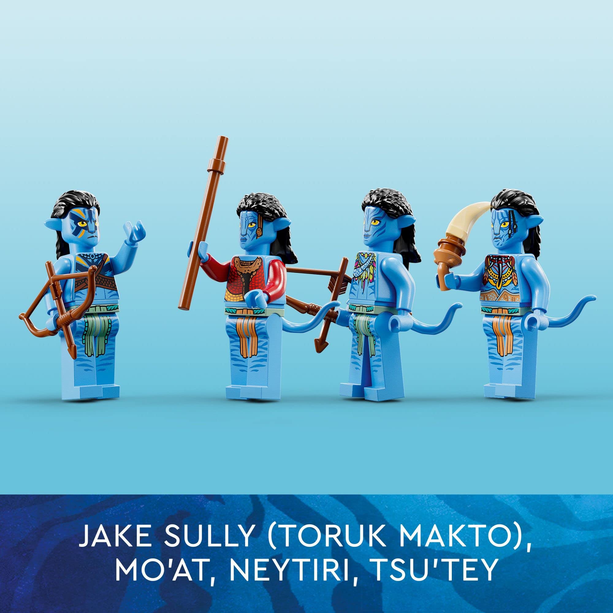 -Na'vi Minifigures Included - Comes with 4 Na'vi LEGO minifigures: Jake Sully, Neytiri, Mo'at, and Tsu'Tey, plus bows, arrows, and spears accessory elements for movie-inspired play.