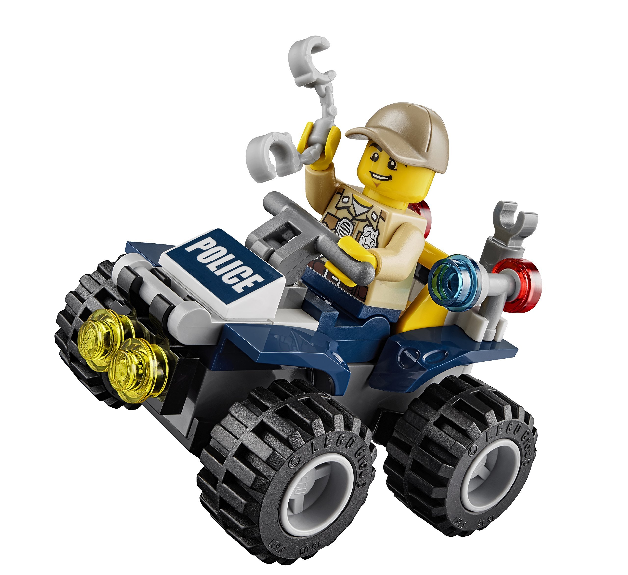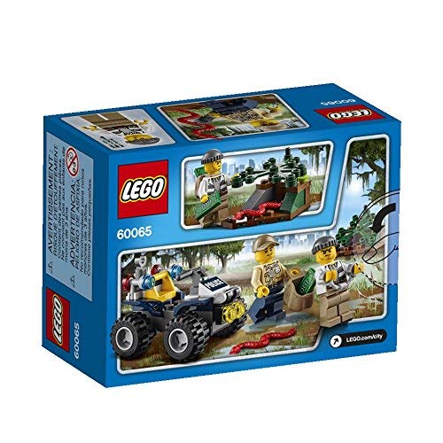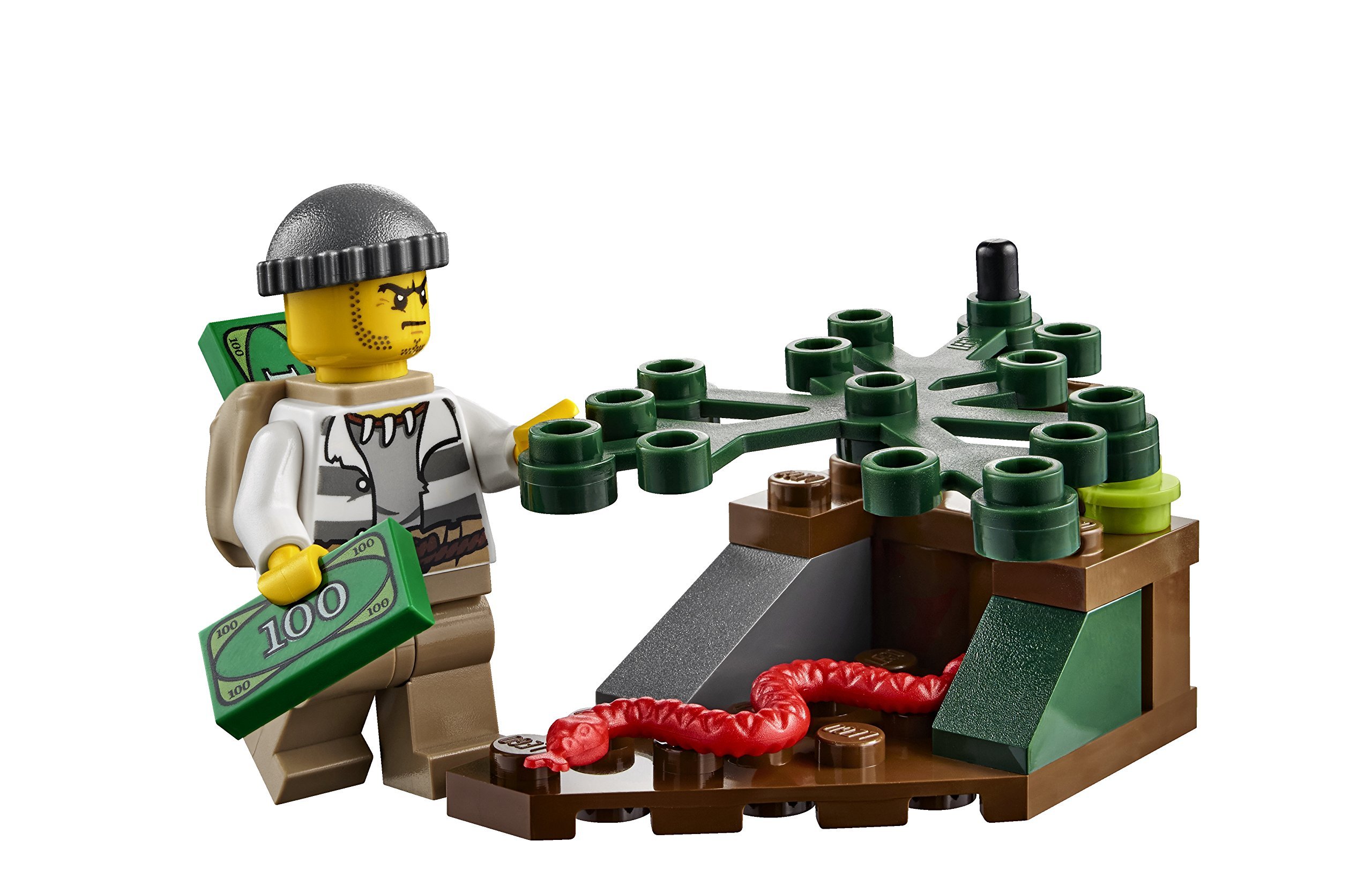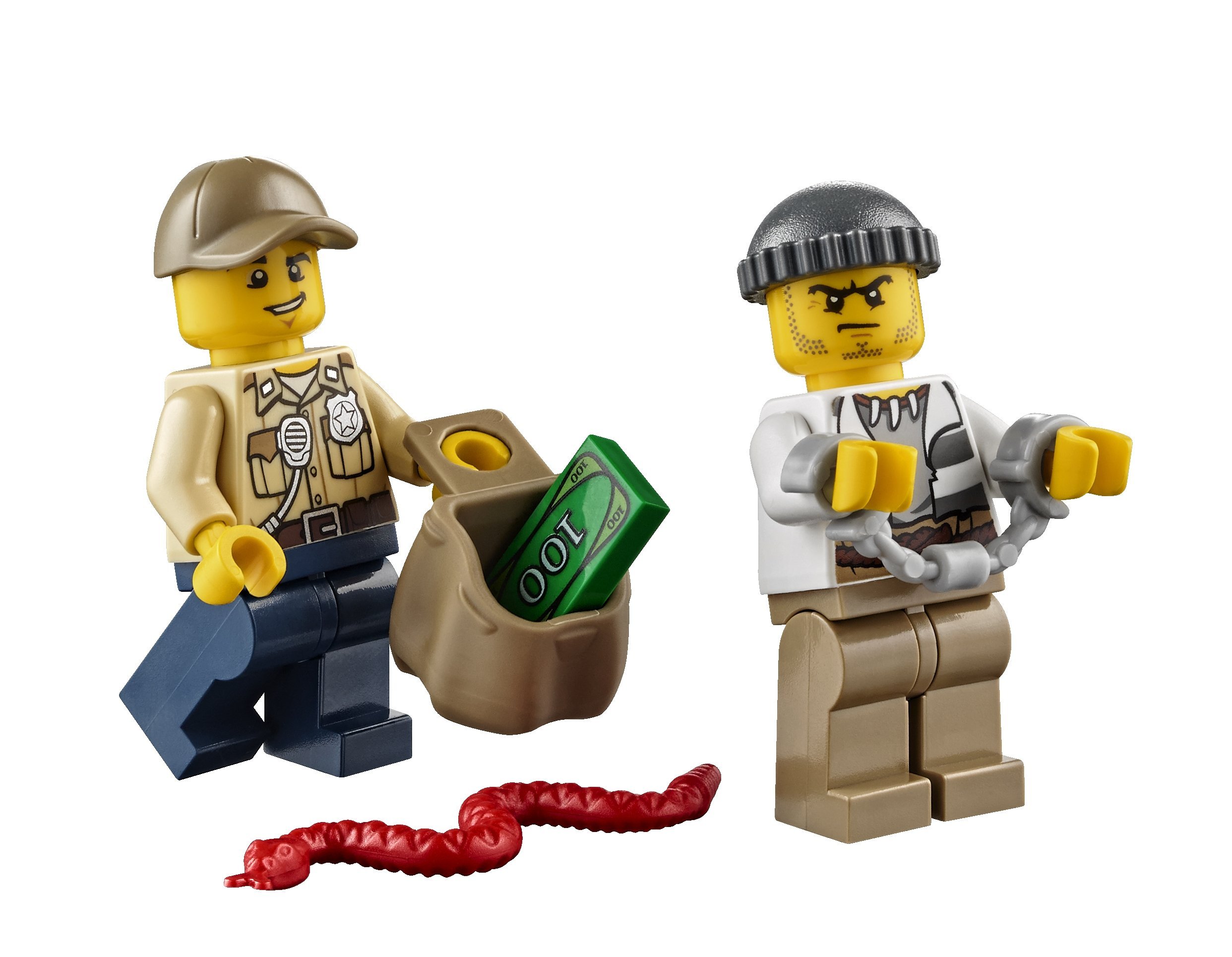 Help. there's a snake! The crook is busy hiding a backpack full of loot in the swamp when a long, slippery snake appears! Jump aboard the awesome ATV and race to the scene! Help the police officer catch the snake with the long snake grabber, then slap the handcuffs on the trembling crook! Includes 2 minifigures with assorted accessories: a police officer and a crook.
